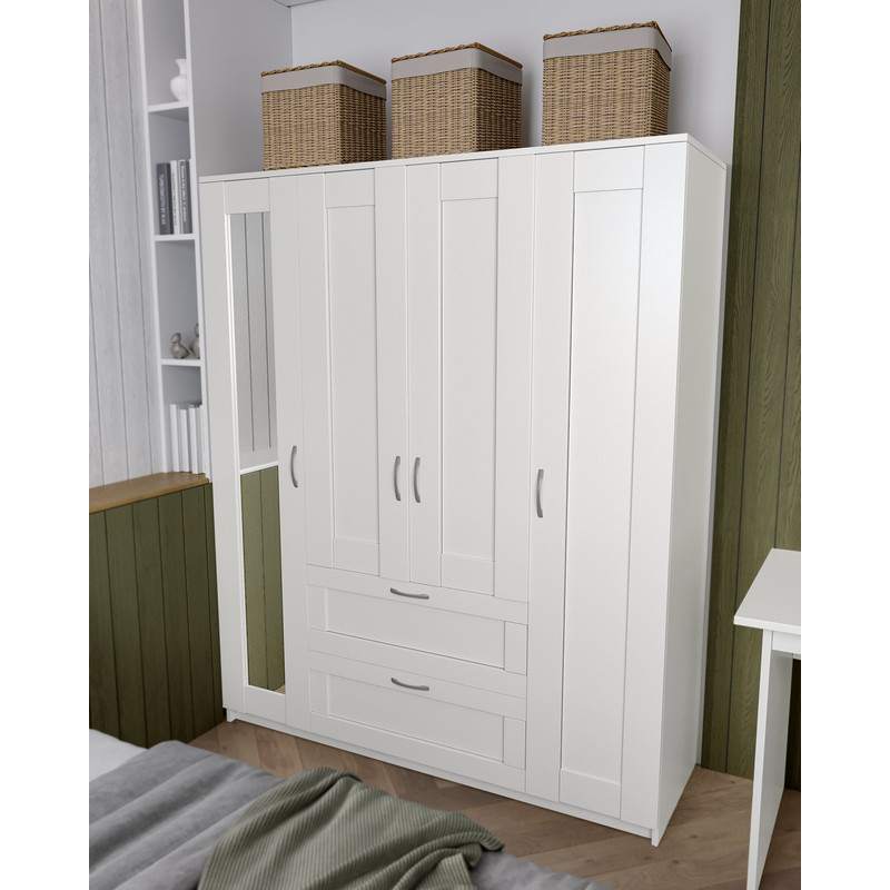 Шкаф СИРИУС комбинированный для одежды четырехдверный, с двумя выдвижными ящиками и одним зеркалом, 1561х502х1900, цвет Белый. Изготовлен из кашированного ДСП толщиной 16 мм. Крепится к стене. Гарантийный срок для жилых помещений 24 месяца, для общественных помещений - 18 месяцев.