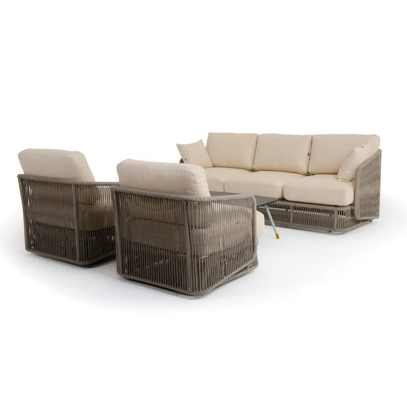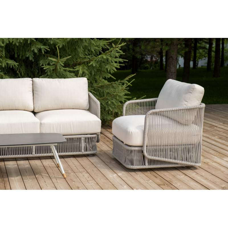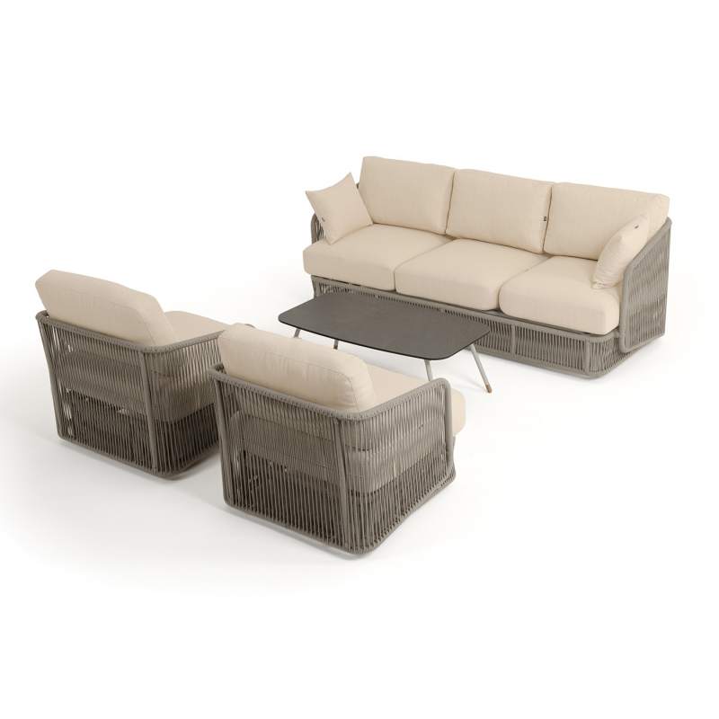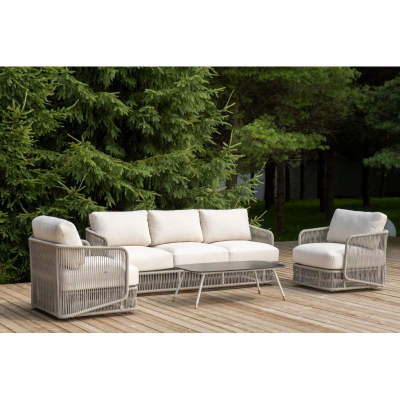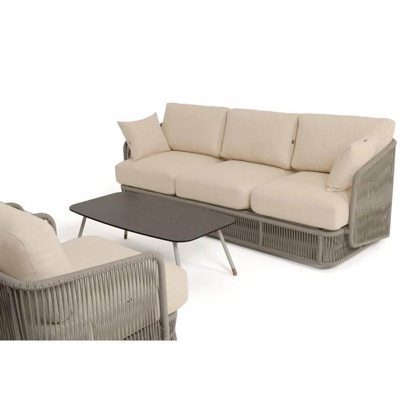 "Альбано" диван 3-местный плетеный из роупа, каркас алюминий светло-серый (RAL7035) муар, роуп серый 1шт. 2 320Х865Х780, "Альбано" кресло плетеное из роупа, каркас алюминий светло-серый (RAL7035) муар, роуп серый меланж к 2шт. 920Х865Х750, "Верона" журнальный стол из HPL 120х65, H40, каркас светло-серый (RA L7035) муар, цвет столешницы "с 1шт. 1 200Х650Х400,