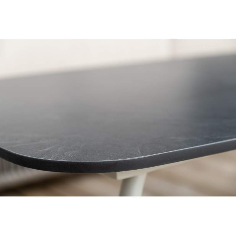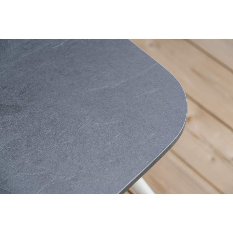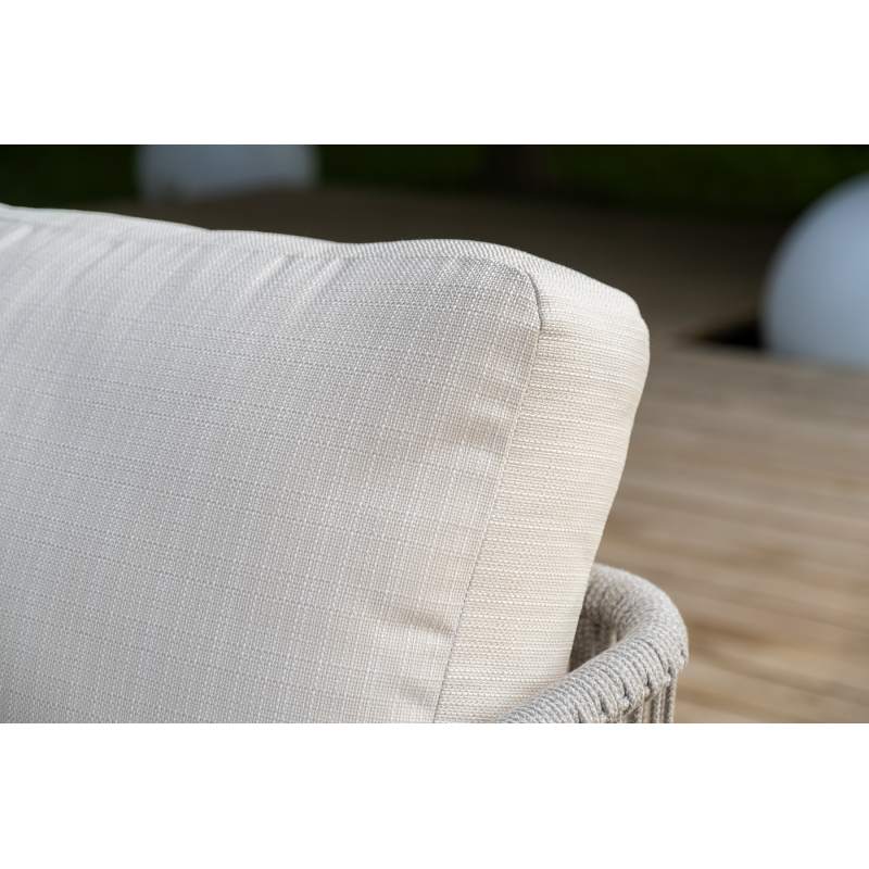 Каркас уличной мебели выполнен из износостойкого алюминия. Его дополняет бежевая ручная оплетка, изготовленная на основе эластичных синтетических лент из полиэфирных волокон высокой прочности (роупа).