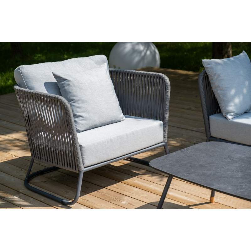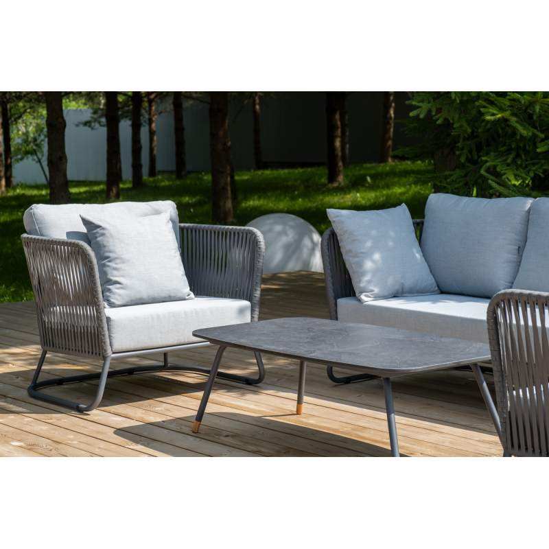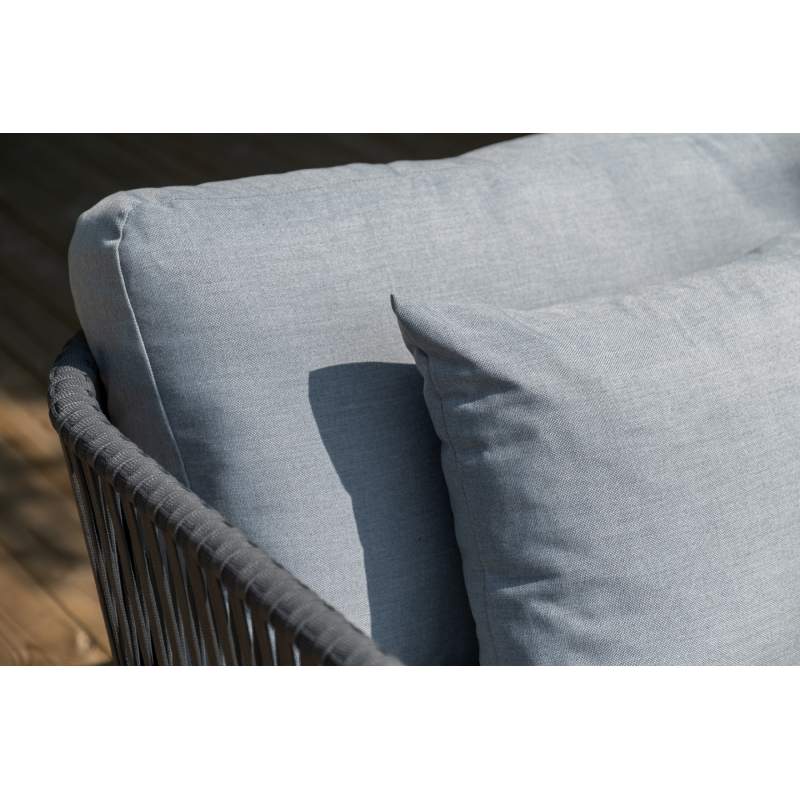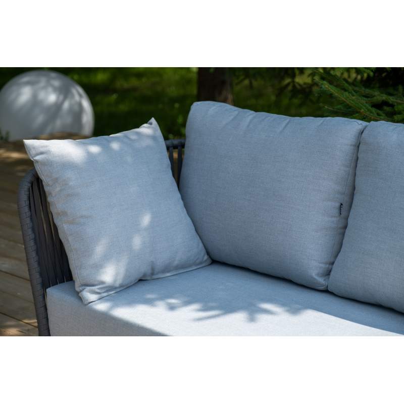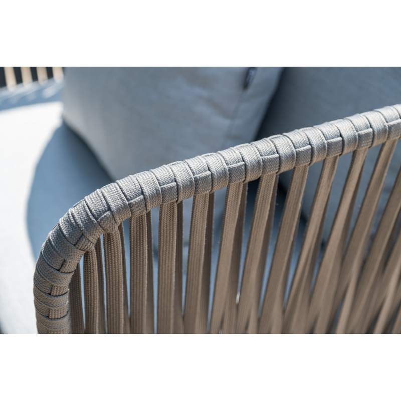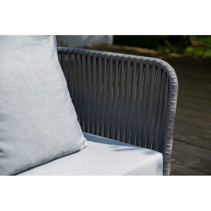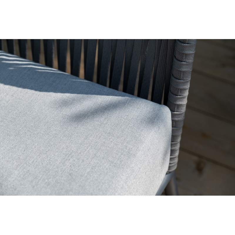 Каркас уличной мебели выполнен из износостойкого алюминия. Его дополняет серая ручная оплетка, изготовленная на основе эластичных синтетических лент из полиэфирных волокон высокой прочности (роупа).