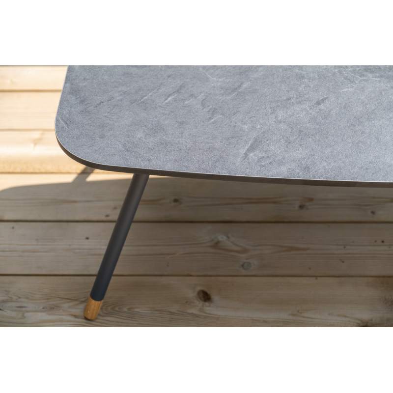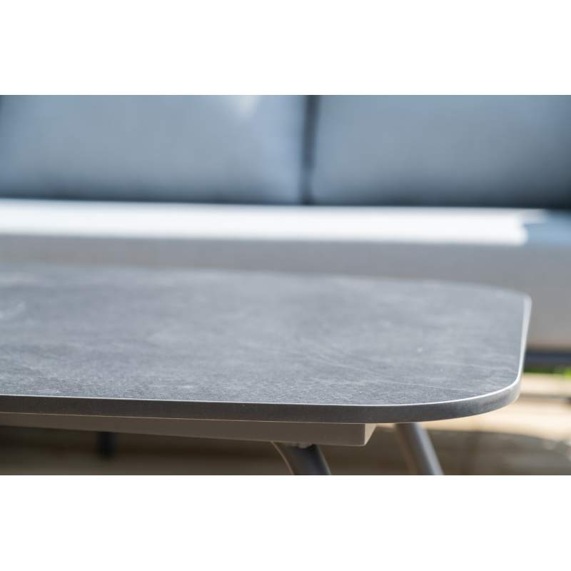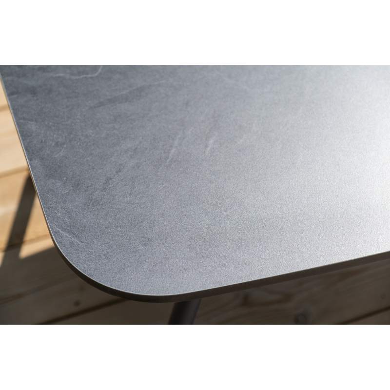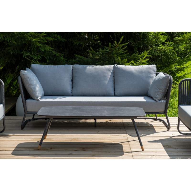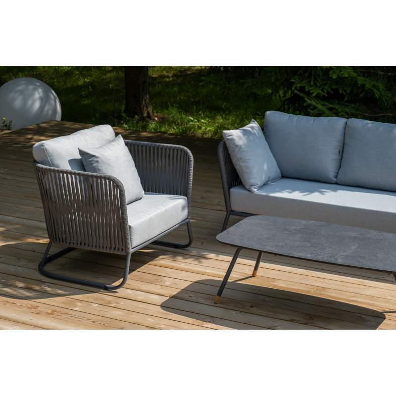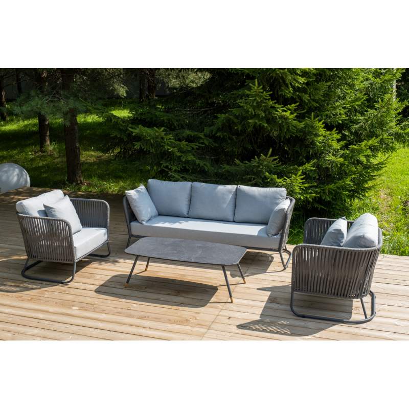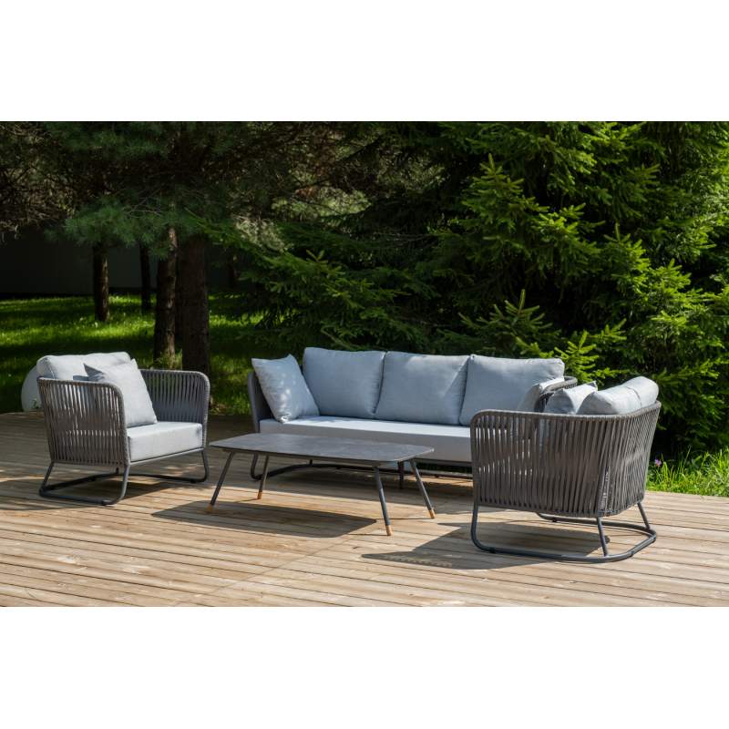 Каркас уличной мебели выполнен из износостойкого алюминия. Его дополняет серая ручная оплетка, изготовленная на основе эластичных синтетических лент из полиэфирных волокон высокой прочности (роупа).