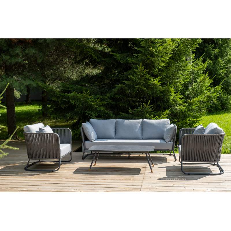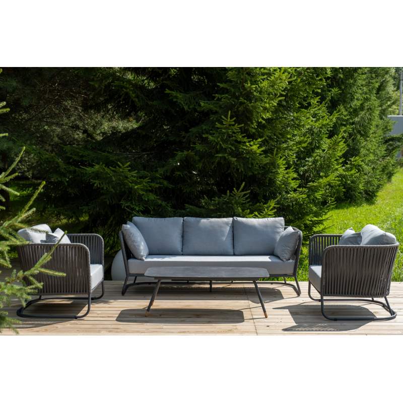 Кресла и диван идут в комплекте с мягкими подушками в чехлах светло-серого цвета. "Багамы" диван 3-местный плетеный из роупа, каркас алюминий темно-серый (RAL7024) муар, роуп серый 1 1шт. 2 000Х800Х735, "Багамы" кресло плетеное из роупа, каркас алюминий темно-серый (RAL7024) муар, роуп серый 15мм, ткан 2шт. 920Х800Х735, "Верона" журнальный стол из HPL 120х65, H40, каркас черный муар, цвет столешницы "серый гранит" 1шт. 1 200Х650Х400,
