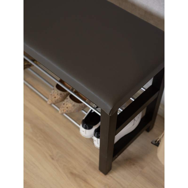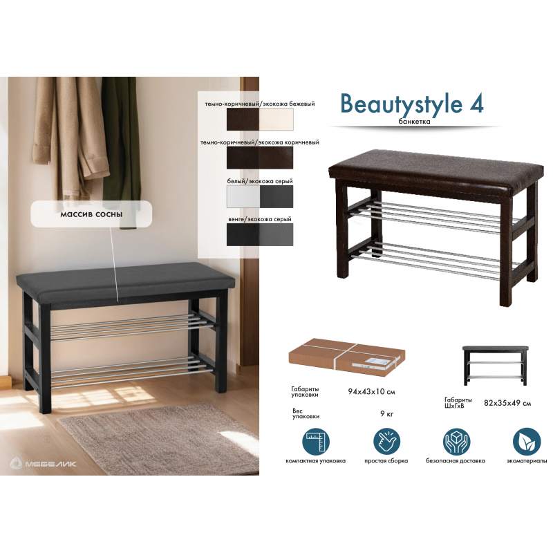 Банкетка BeautyStyle 4 – это и удобные полки для хранения сезонной обуви, и мягкое сидение! Прочная конструкция из массива сосны гарантирует надёжность и долгую службу изделия, ведь опоры толщиной 3,6см стоят твёрдо и непоколебимо, а металлические прутья диаметром 10мм позволяют удобно хранить совершенно любую обувь буквально под рукой. Мягкое сидение из поролона и экокожи поможет Вам навсегда забыть о дискомфорте при обвувании и придаст эстетичный вид вашей прихожей. Расстояние между полками 18см, а расстояние от пола всего 8см, что делает банкетку компактной, но вместительной! Она подходит как для дома, так и для офиса! На Ваш выбор предоставляются четыре стильных и модных цветовых дизайнов, подходящих для любого интерьера и подчёркивающих Ваш вкус!