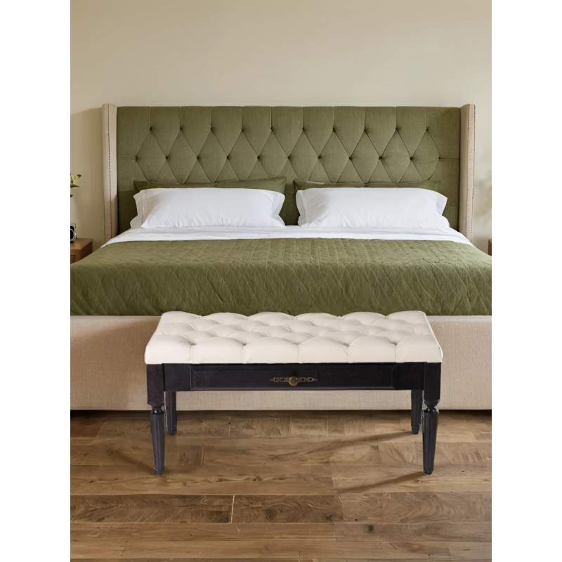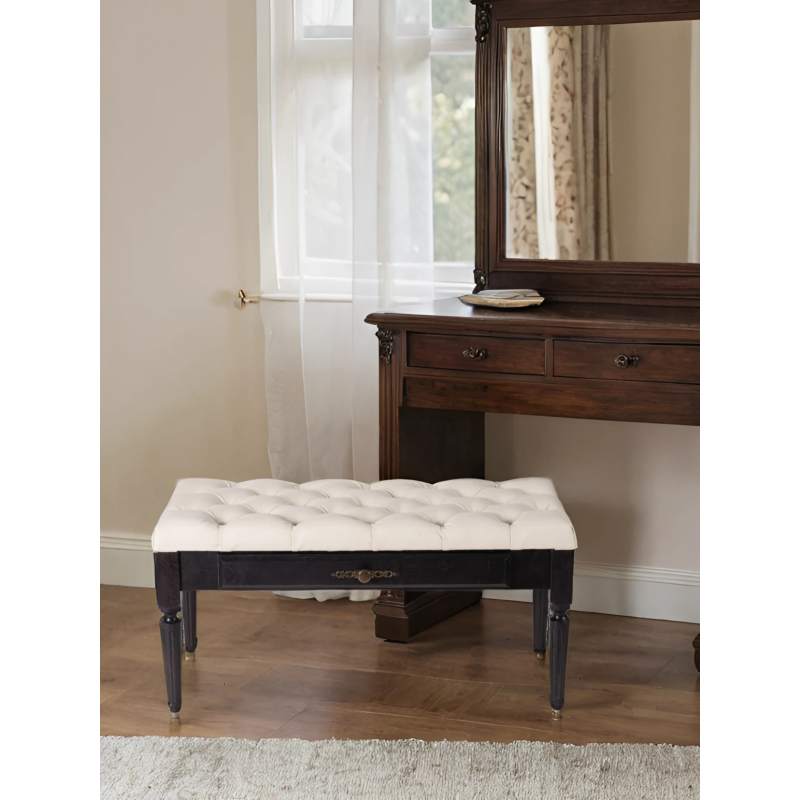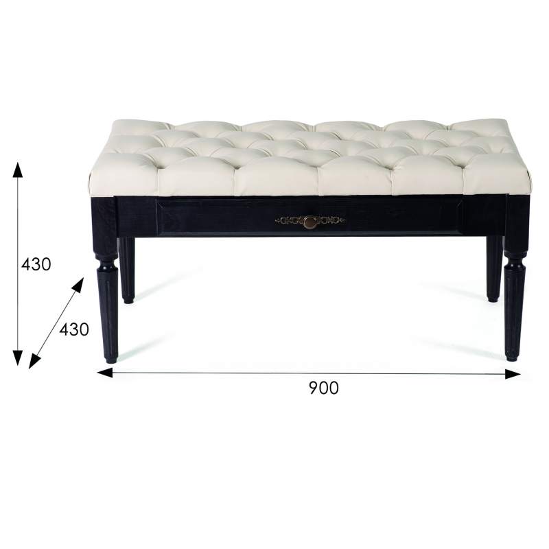 При своей экономичности эта банкетка изготовлена из массива березы, что делает ее надежной в эксплуатации. Стеганая подушка выполнена из экокожи, цвет которой вы можете подобрать из представленных вариантов. Выдвижной ящик предназначен для хранения различных мелочей, его фасад дополнен декоративной ручкой цвета бронзы. Ножки имеют классическую форму на конус с вертикальными фрезеровками.