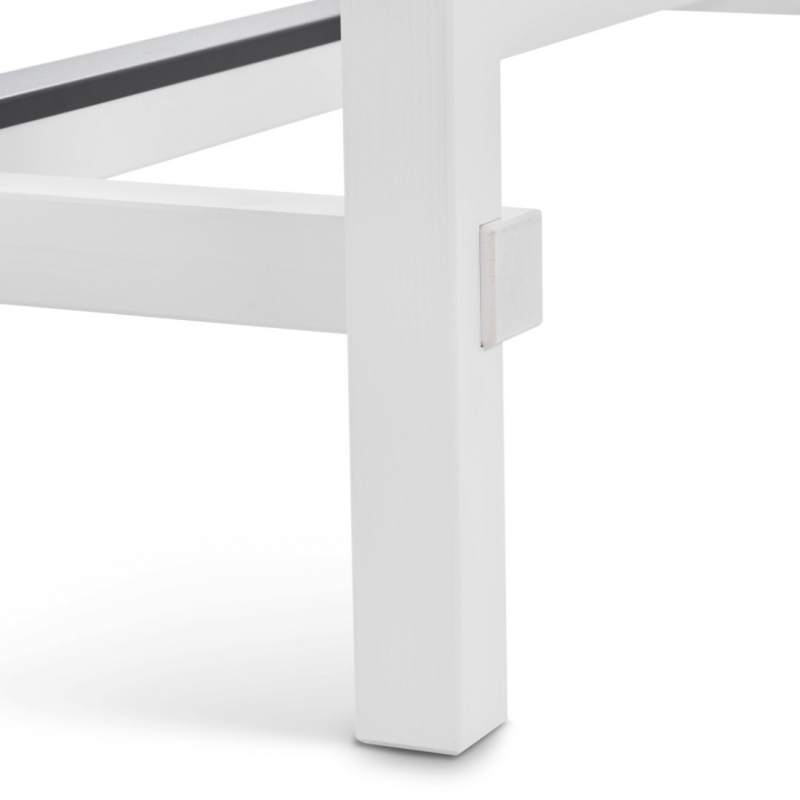 Стол изготовлен из ДСП и массива сосны. Покрытие выполнено с использованием красителей на водной основе и лака на основе акриловых смол с УФ-отверждением. Такое покрытие обеспечивает долговечность изделия, устойчивость к потертостям и царапинам, а также простоту в уходе — достаточно легкой влажной уборки.