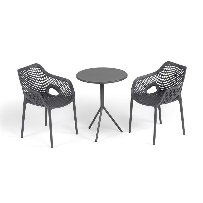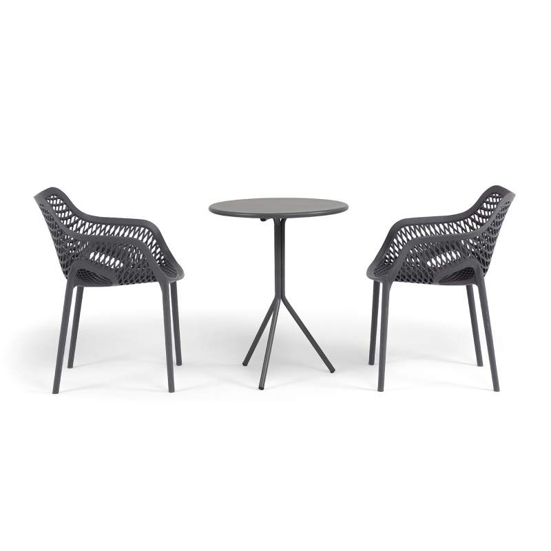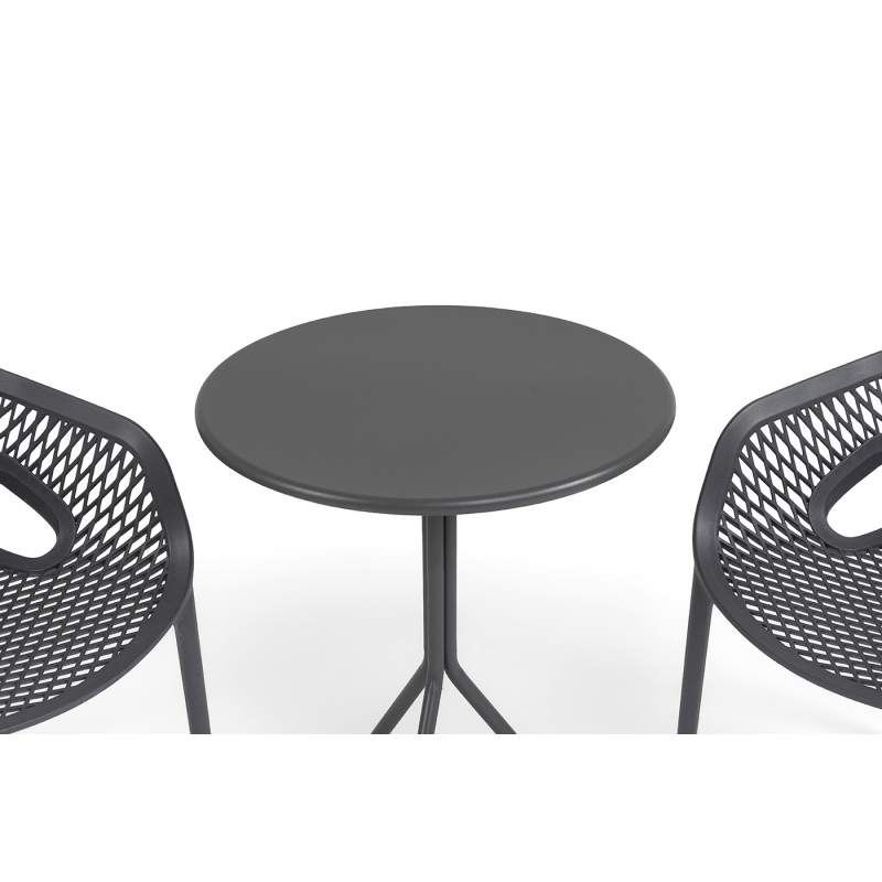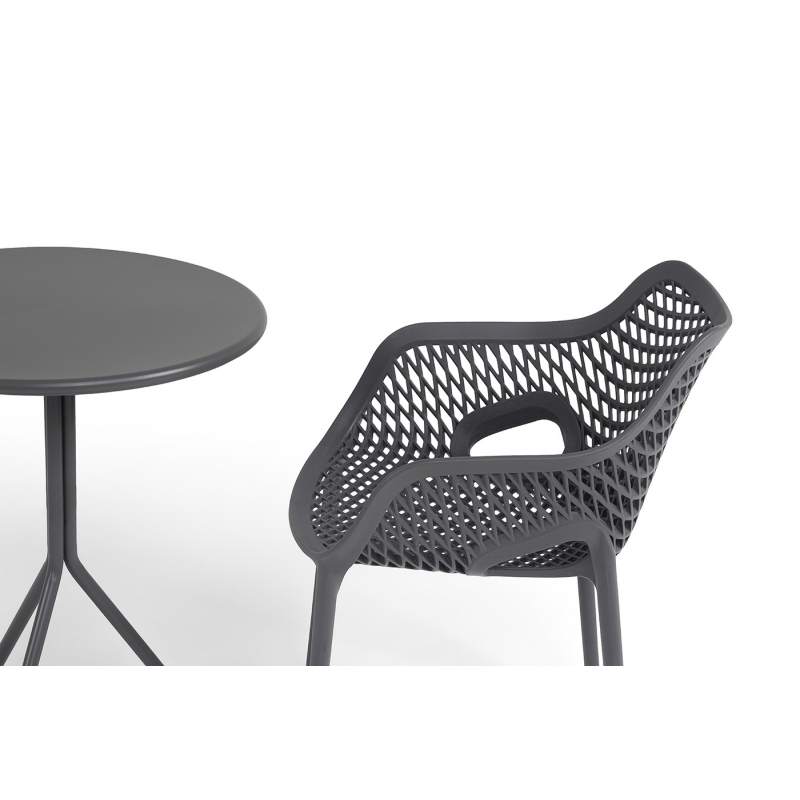 Стулья изготовлены из полипропилена, прочного и стойкого пластика, устойчивого к УФ-излучению, благодаря этому стул сохраняет свой первоначальный вид и не выцветает на солнце даже несмотря на активную эксплуатацию. Цвет - темно-серый. "Мохито" стальной круглый стол Ø60см, цвет темно-серый 1шт. 600Х600Х750, "Беллини" стул пластиковый, цвет темно-серый 2шт. 540Х610Х810,