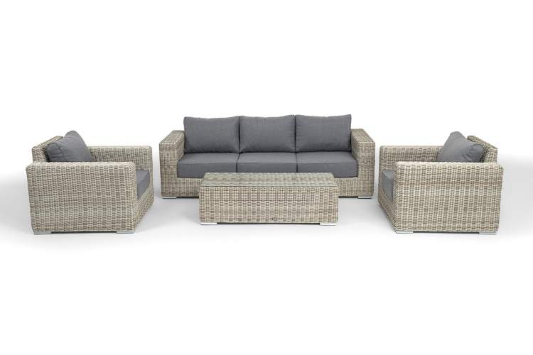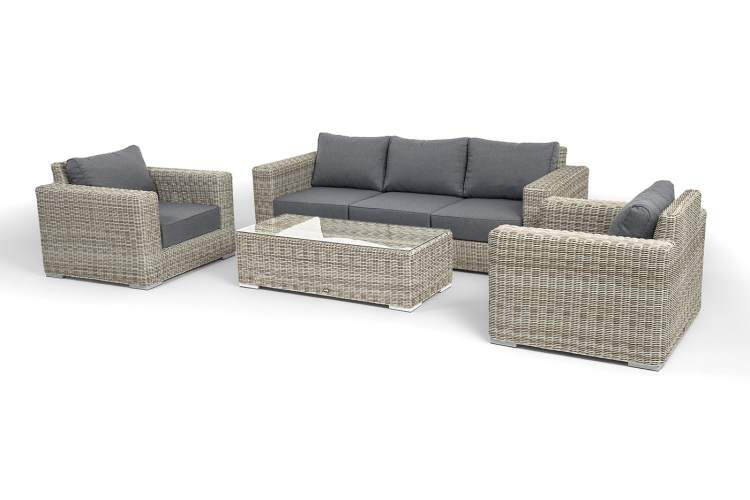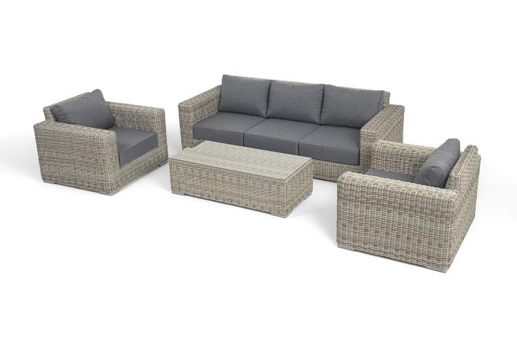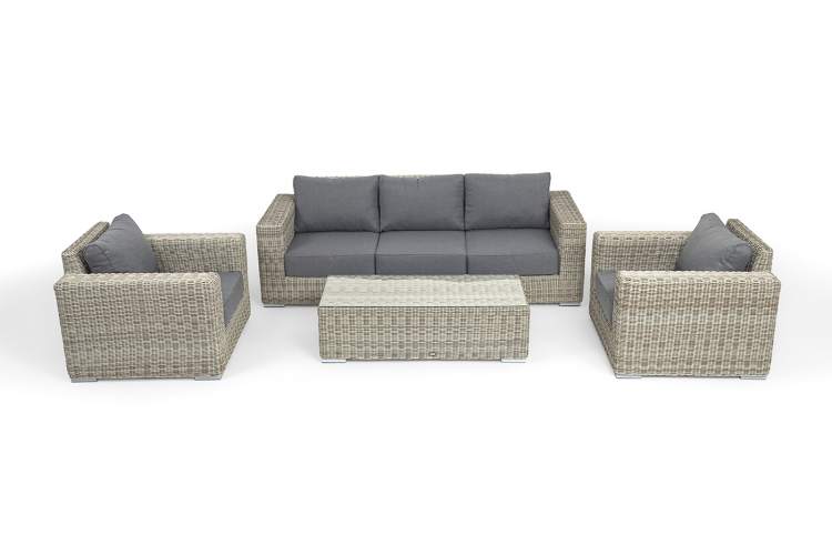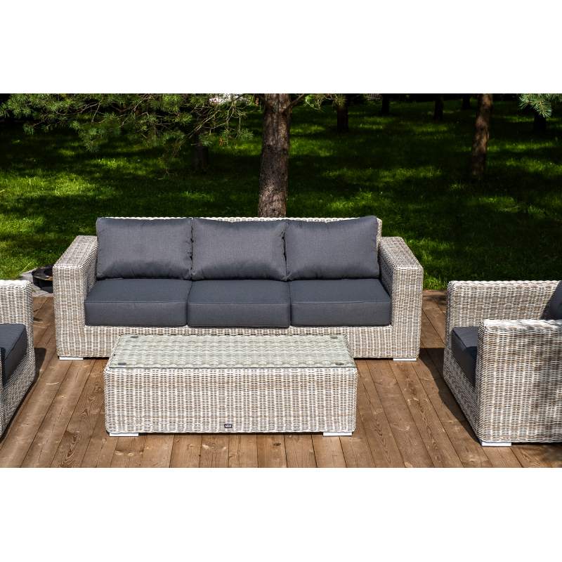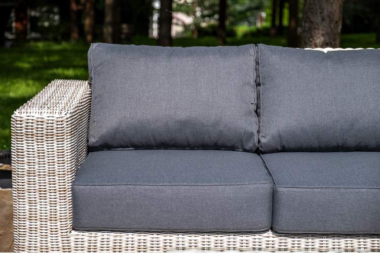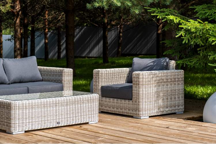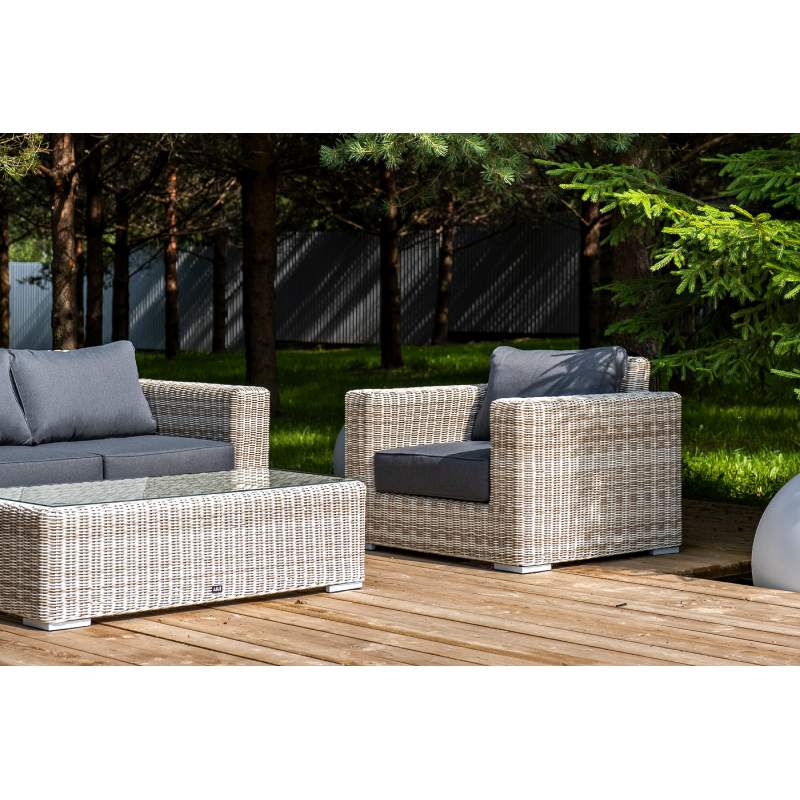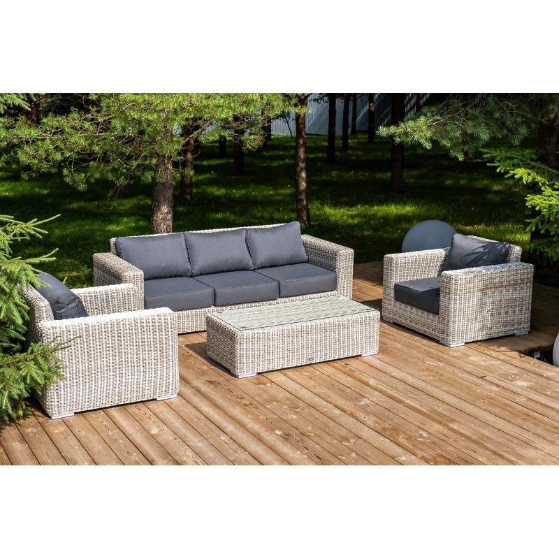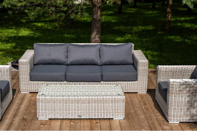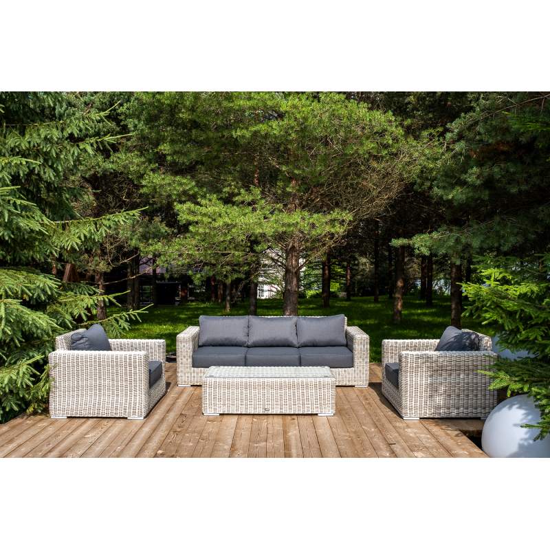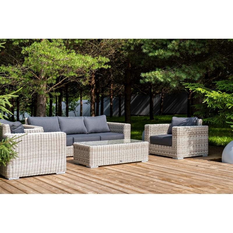 Комплект «Боно» с плетением из искусственного круглого ротанга для обустройства лаунж-зоны. В ее составе находятся: - трехместный диван – 2300×900×775 мм. - два кресла – 1000×900×775 мм. - журнальный столик – 1300×600×400 мм. В качестве основы применяется прочный алюминиевый каркас. Цвет комплекта – бежевый. На креслах и диване предусмотрены мягкие подушки, съёмные чехлы которых пошиты из полиэстера, плотностью 300гр/м2. Ткань в обязательном порядке пропитывается влагоотталкивающими составами. Поверхность плетеного столика представляет столешница из закаленного стекла – 5 мм. "Боно" диван из искусственного ротанга трехместный, цвет бежевый 1шт. 2 300Х900Х775, "Боно" кресло из искусственного ротанга, цвет бежевый 2шт. 1 020Х930Х800, "Боно" журнальный столик из искусственного ротанга, цвет бежевый 1шт. 1 300Х600Х400,