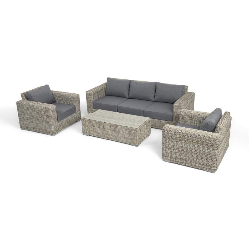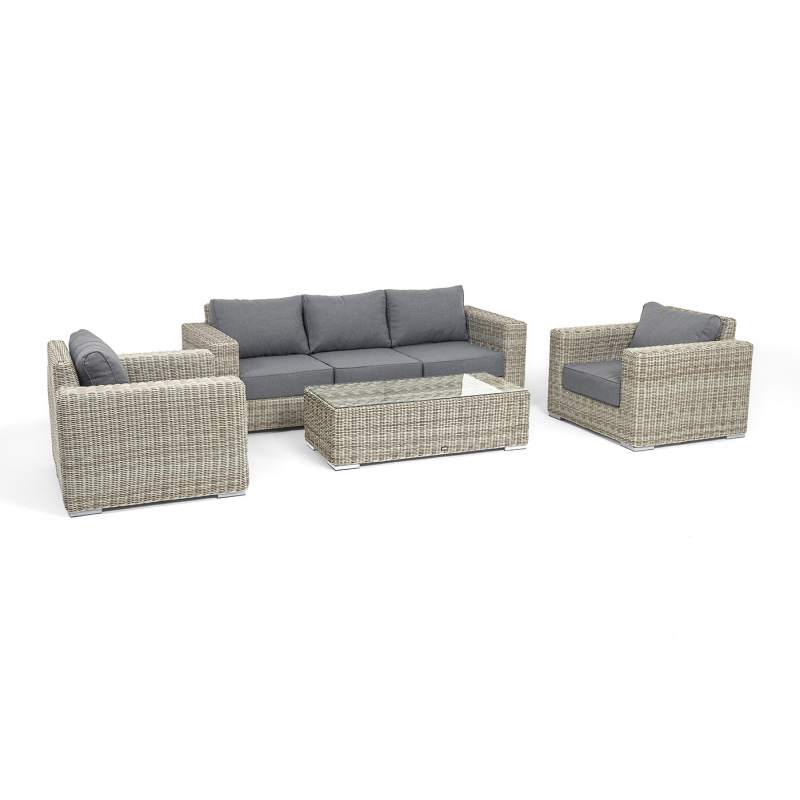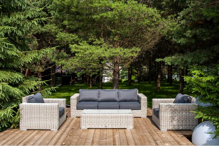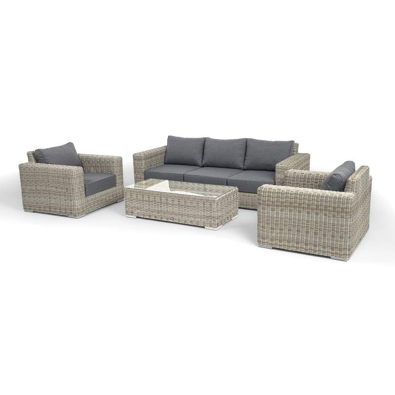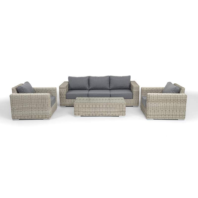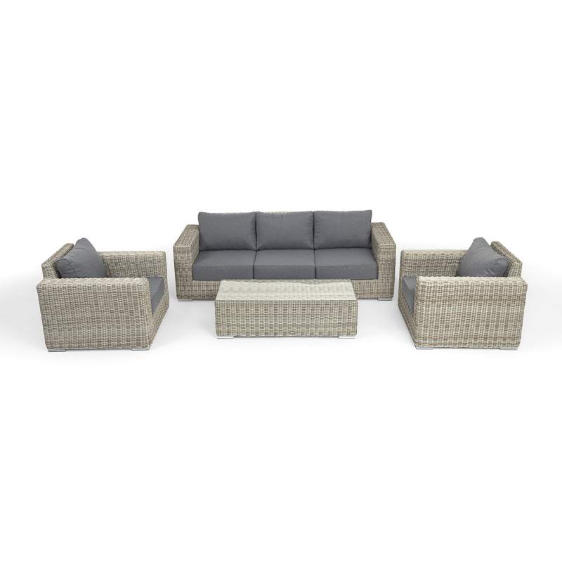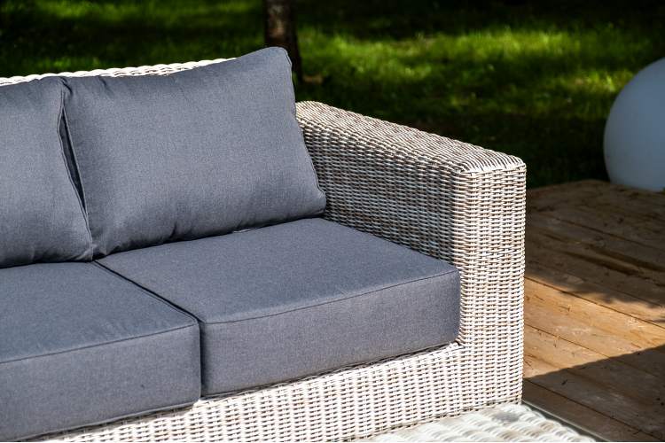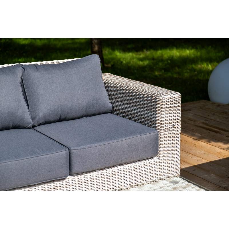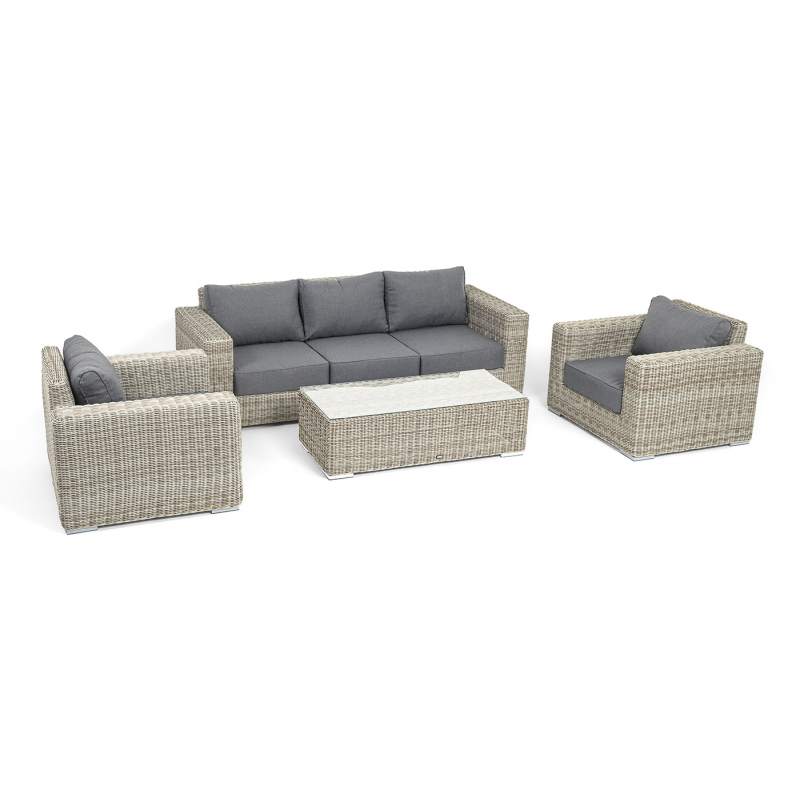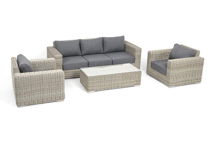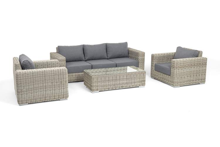 Комплект «Боно» с плетением из искусственного круглого ротанга для обустройства лаунж-зоны. В ее составе находятся: - трехместный диван – 2300×900×775 мм. - два кресла – 1000×900×775 мм. - журнальный столик – 1300×600×400 мм. В качестве основы применяется прочный алюминиевый каркас. Цвет комплекта – бежевый. На креслах и диване предусмотрены мягкие подушки, съёмные чехлы которых пошиты из полиэстера, плотностью 300гр/м2. Ткань в обязательном порядке пропитывается влагоотталкивающими составами. Поверхность плетеного столика представляет столешница из закаленного стекла – 5 мм. "Боно" диван из искусственного ротанга трехместный, цвет бежевый 1шт. 2 300Х900Х775, "Боно" кресло из искусственного ротанга, цвет бежевый 2шт. 1 020Х930Х800, "Боно" журнальный столик из искусственного ротанга, цвет бежевый 1шт. 1 300Х600Х400,