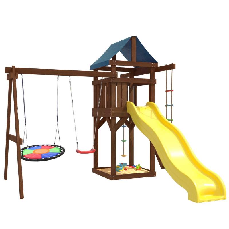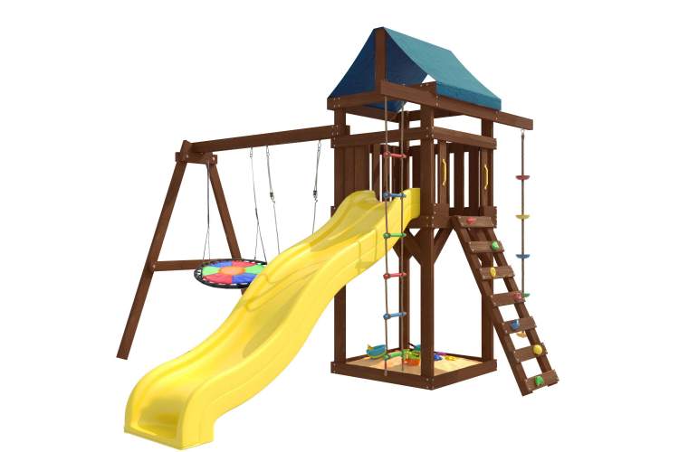 Детская площадка IgroWoods Premium - отличное решение для активного отдыха детей на свежем воздухе. Она представляет собой многофункциональный игровой комплекс, который включает в себя горку, качели, песочницу, игровую веранду, веревочную лестницу, скалодром и канат. Все элементы выполнены из качественных и безопасных материалов, что обеспечивает долговечность и надежность конструкции. Площадка плотно окрашена в 2 слоя, защитный слой толще, прочнее и лучше защищает поверхность от внешних воздействий. Площадка изготавливается из бразильской сосны, долговечного и износостойкого материала. Материал имеет естественную древесную текстуру, обработан специальными составами для большего срока использования и предохранения от разрушения древесины. Все элементы проходят предварительную шлифовку, а края изделия закруглены. Небольшое количество металлических элементов значительно исключает возможность получения ребенком травм. В состав площадки входит вся необходимая фурнитура для сборки. Детская игровая площадка является многофункциональным спортивным игровым комплексом для детей от 3 до 14 лет. С помощью этой площадки дети смогут развить свою физическую форму, координацию движений и логическое мышление. Кроме того, игры на свежем воздухе способствуют укреплению иммунитета и улучшению общего состояния здоровья детей. Садовые качели подвесные для улицы детские и взрослые, подойдут абсолютно для всех, так как качельная балка и полиуретановые канаты выдерживают общий вес до 250 кг. На уличных дачных качелях вы можете расслабиться и отдохнуть у себя в саду и провести время со своим ребенком. Характеристики: * Предназначена для детей от 3 до 14 лет. * Силовые детали выполнены из лесоматериалов бразильской сосны. * Размещается площадка на грунте (бетонирование не обязательно). Комплектация: * Башня с тентом; • Подвесные качели Лодочка и разноцветное гнездо Свиби; * Веревочная лестница; * Канат; * Горка; * Скалодром; * Песочница под башней; Размеры и вес комплекса * Высота общая – 270см; * Высота от земли до пола – 120см; * Ширина общая – 373; * Длина общая – 350; Гарантия: 12 месяцев Срок службы: от 5 лет