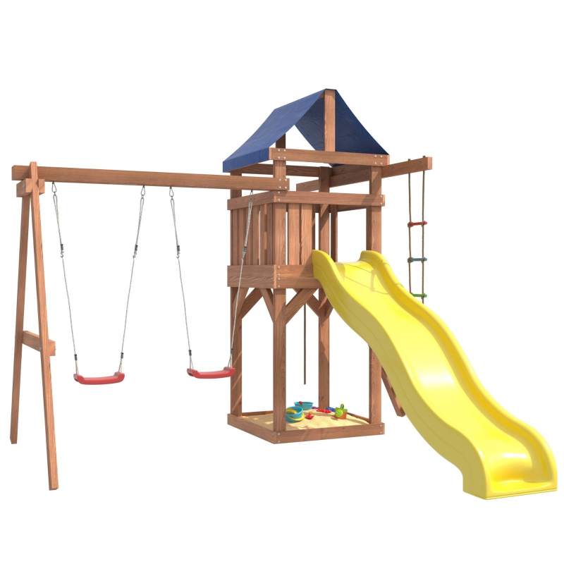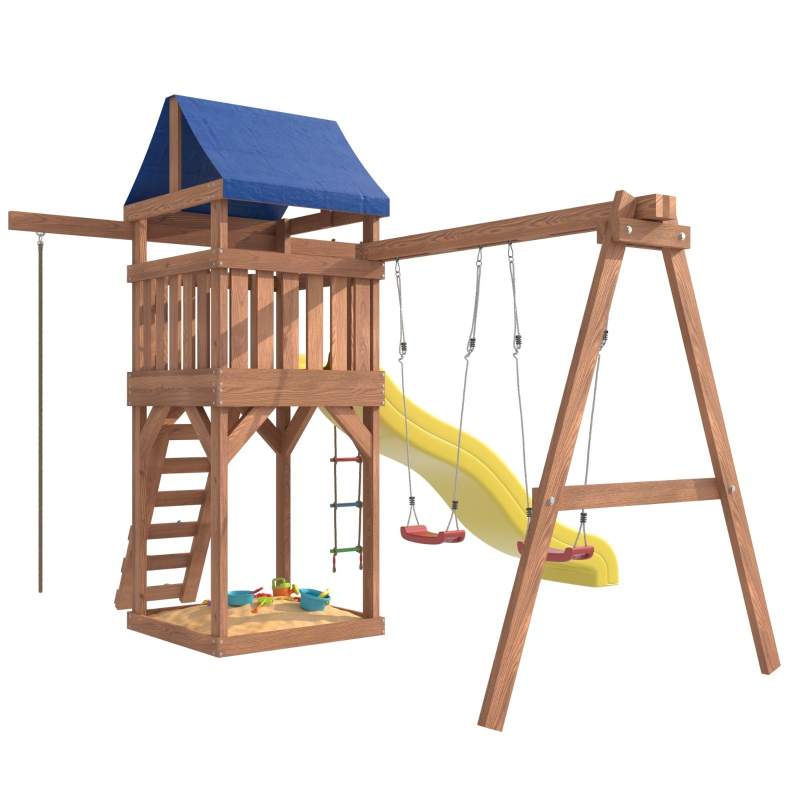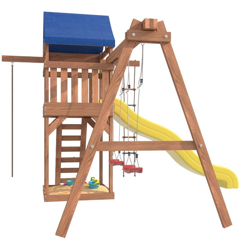 Площадка изготавливается из лесоматериалов лиственных и хвойных пород. Материал имеет естественную древесную текстуру, обработан специальными составами для большего срока использования и предохранения от разрушения древесины. Все элементы проходят предварительную шлифовку, а края изделия закруглены. Небольшое количество металлических элементов значительно исключает возможность получения ребенком травм.