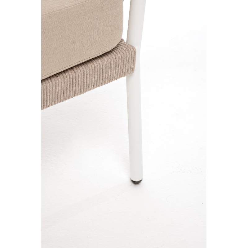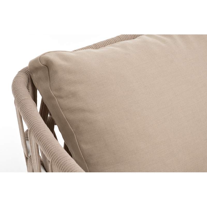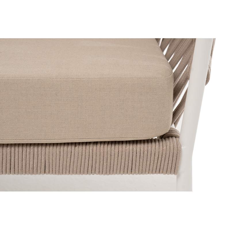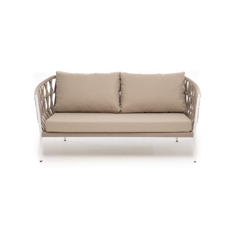 "Диего" диван 2-местный плетеный из роупа, каркас алюминий белый муар, роуп бежевый круглый, ткань бежевая 052