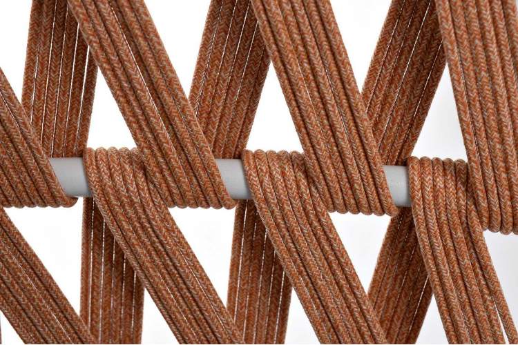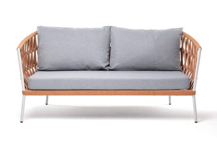 Двухместный диван «Диего» с подушками в комплекте. Диван имеет алюминиевый каркас, окрашенный порошковой краской в светло-серый (RAL7035) цвет. Боковины каркаса и спинка вручную оплетены роупом - эластичными синтетическими лентами, изготовленными из высокопрочных полиэфирных волокон. Цвет оплетки - оранжевый меланж. Подушки состоят из наполнителя и съёмных чехлов, которые обработаны влагоотталкивающей пропиткой светло-серого цвета. Материал - 100% полиэстер, плотностью 300гр/м2. Размер плетеного дивана: 1580×720×770 мм.