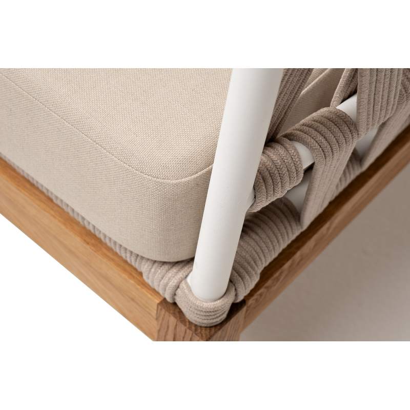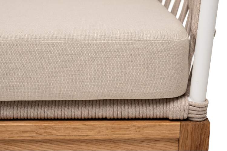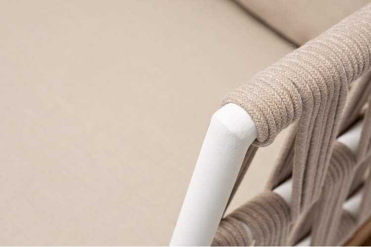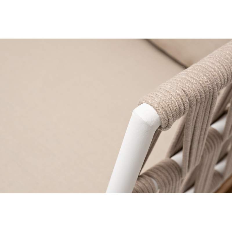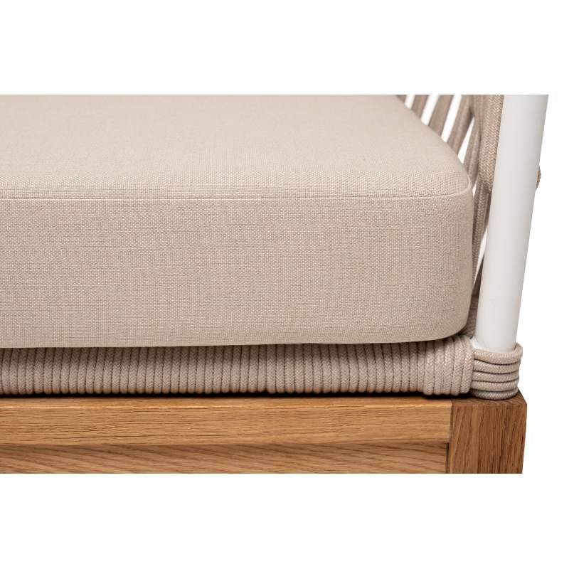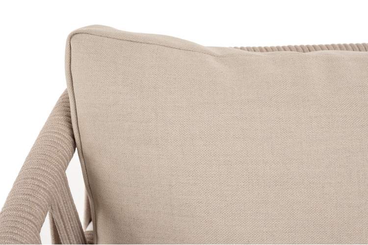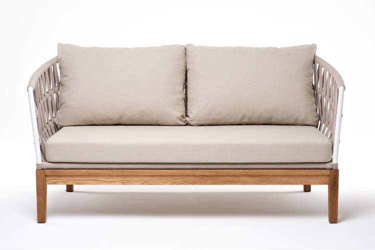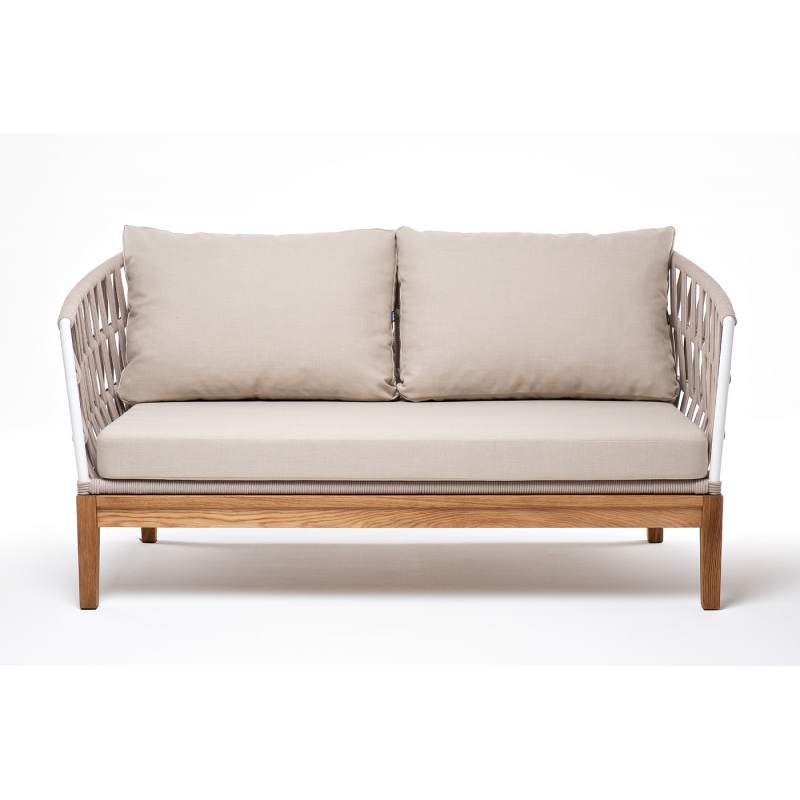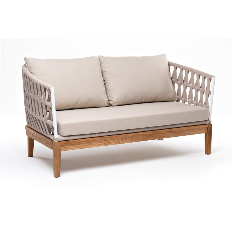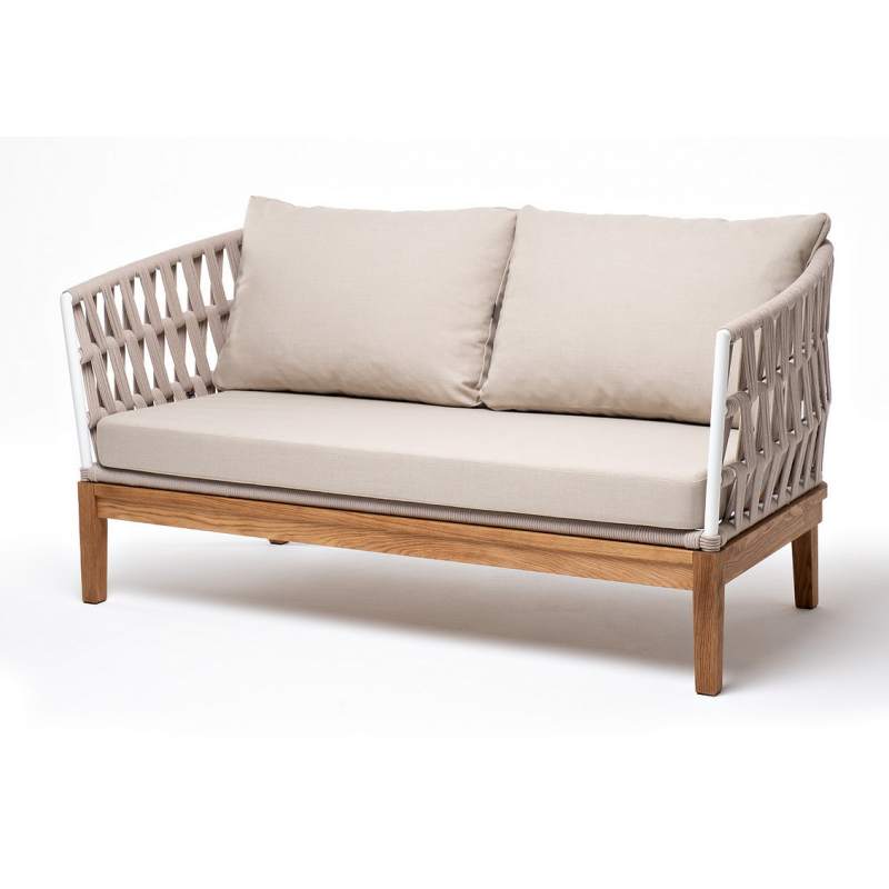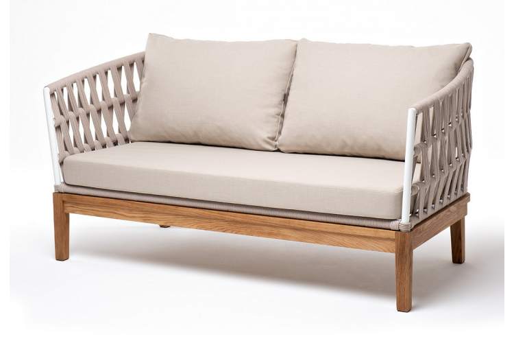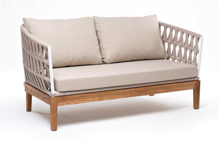 Двухместный диван «Диего» с подушками в комплекте. Основание кресла - дуб, каркас из алюминия светло-серого (RAL7035) цвета. Боковины каркаса вручную оплетены роупом - эластичными синтетическими лентами, изготовленными из высокопрочных полиэфирных волокон. Цвет оплетки - бежевый. Подушки со съёмными чехлами, которые обработаны влагоотталкивающей пропиткой. Материал - 100% полиэстер, плотностью 300гр/м2. Размер кресла: 1580×720×800 мм.