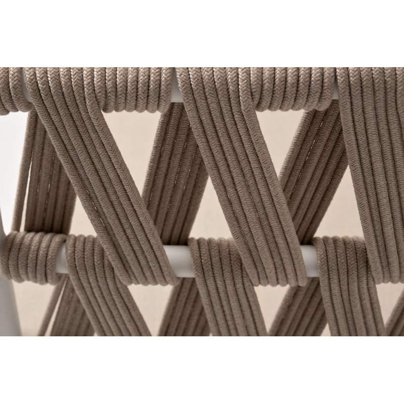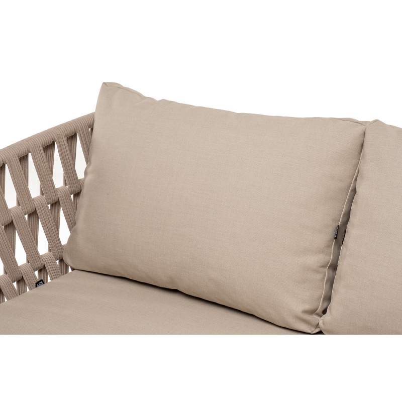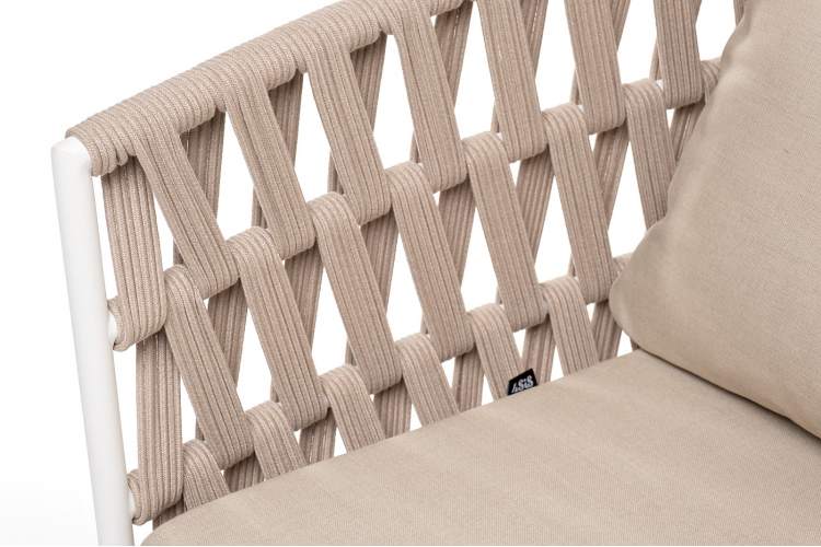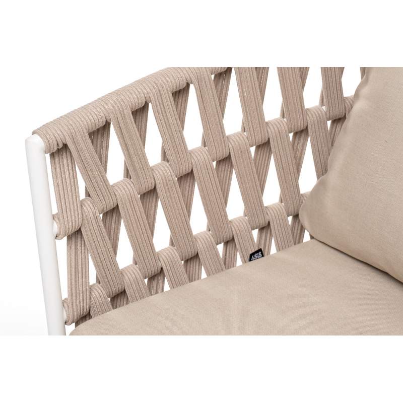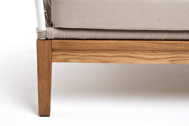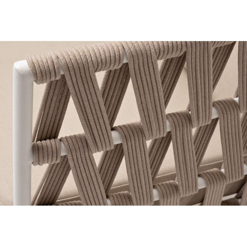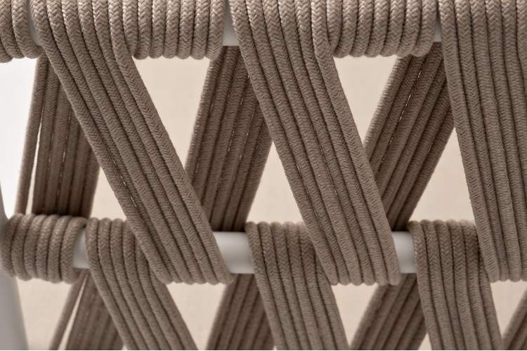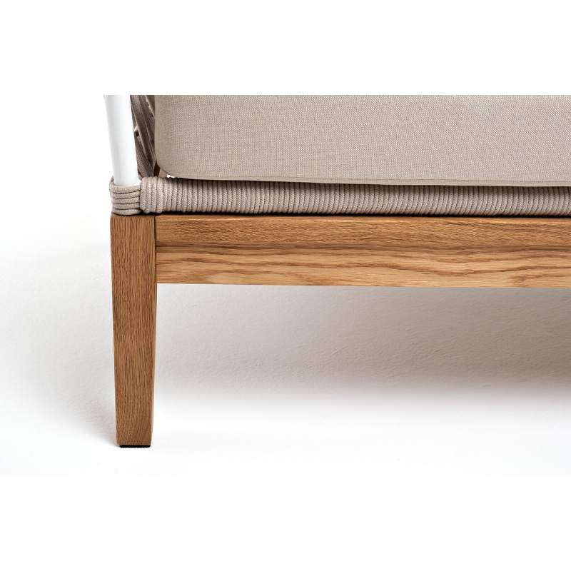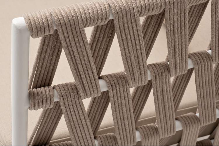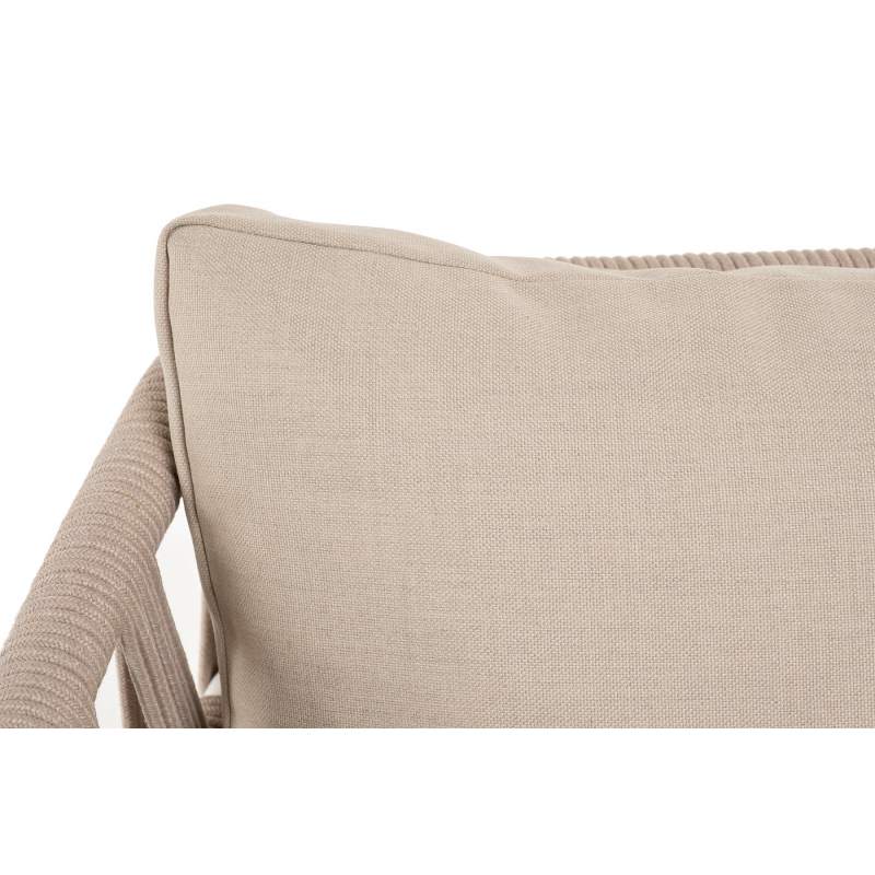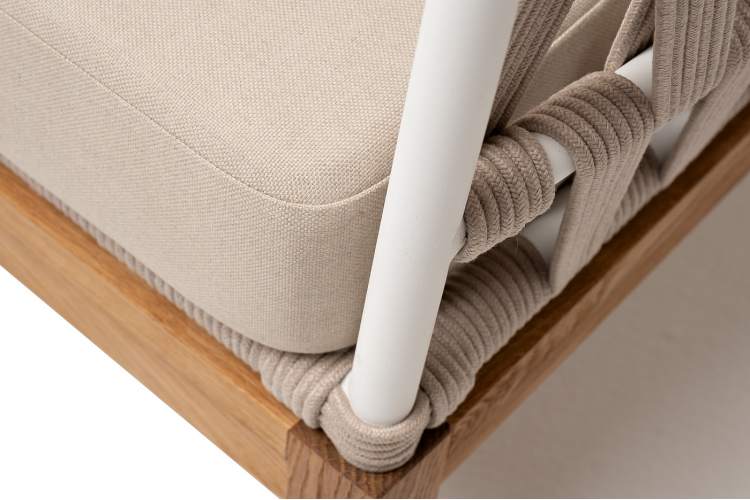 Двухместный диван «Диего» с подушками в комплекте. Основание кресла - дуб, каркас из алюминия светло-серого (RAL7035) цвета. Боковины каркаса вручную оплетены роупом - эластичными синтетическими лентами, изготовленными из высокопрочных полиэфирных волокон. Цвет оплетки - бежевый. Подушки со съёмными чехлами, которые обработаны влагоотталкивающей пропиткой. Материал - 100% полиэстер, плотностью 300гр/м2. Размер кресла: 1580×720×800 мм.