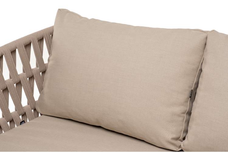 "Диего" диван 2-местный плетеный из роупа, основание дуб, каркас алюминий светло-серый (RAL7035) шагрень, роуп бежевый круглый, ткань бежевая 15052