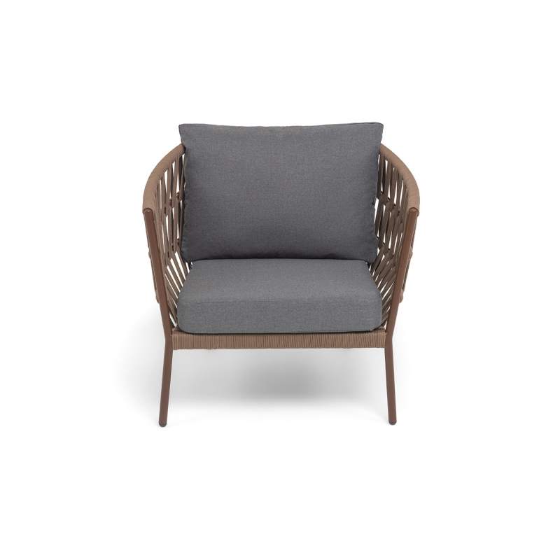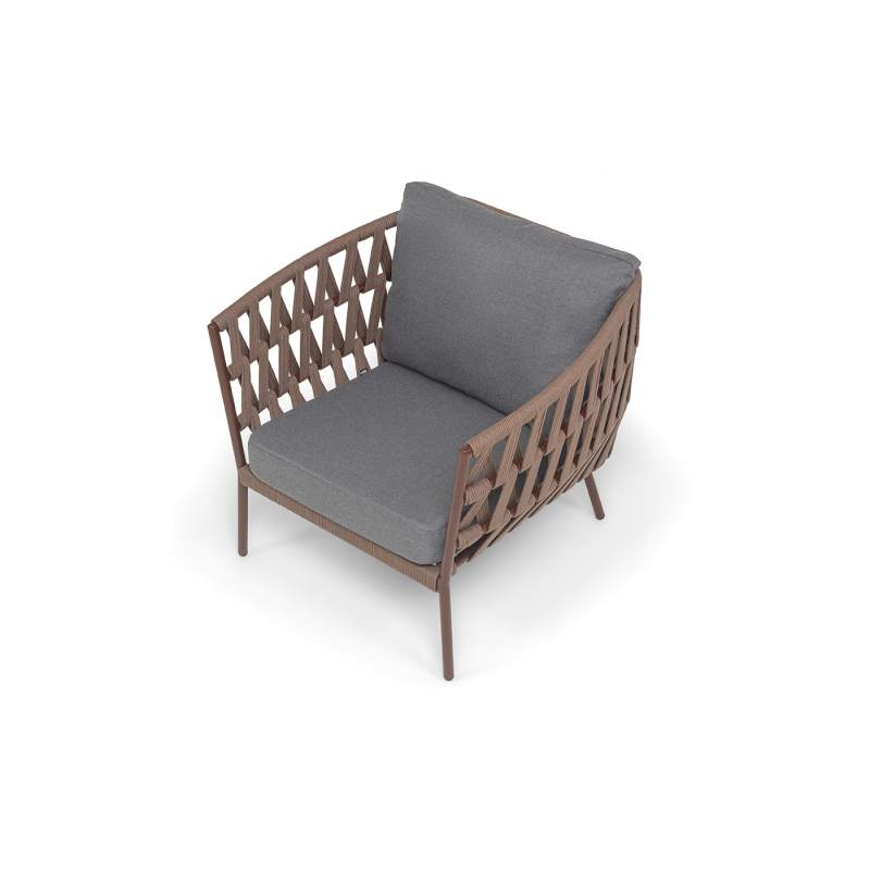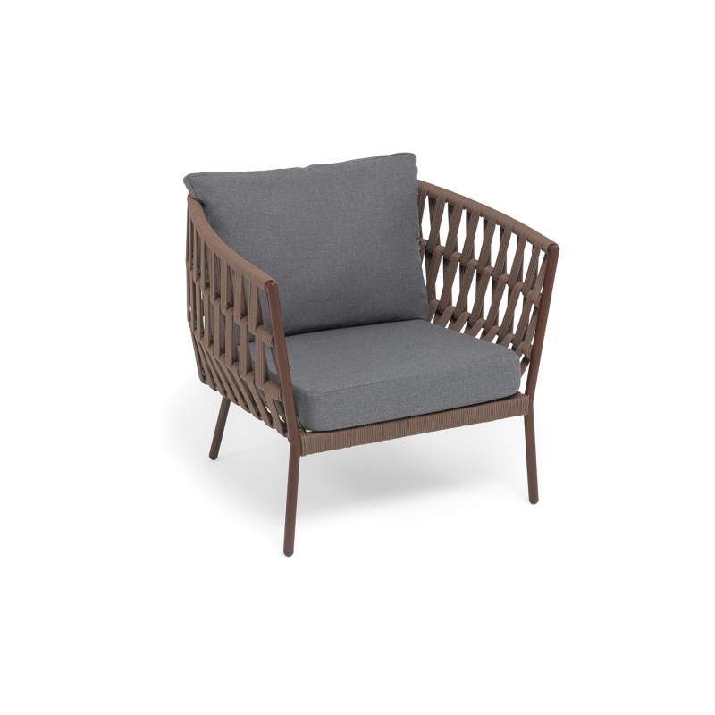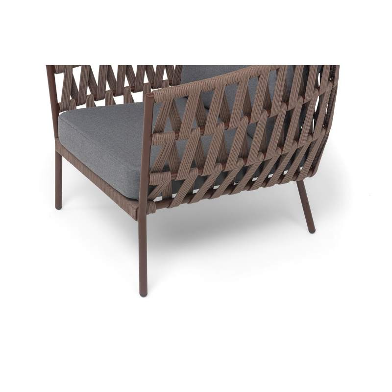 Кресло имеет алюминиевый каркас, окрашенный порошковой краской в коричневый (RAL8016) цвет. Боковины каркаса вручную оплетены роупом - эластичными синтетическими лентами, изготовленными из высокопрочных полиэфирных волокон. Цвет оплетки - коричневый.
