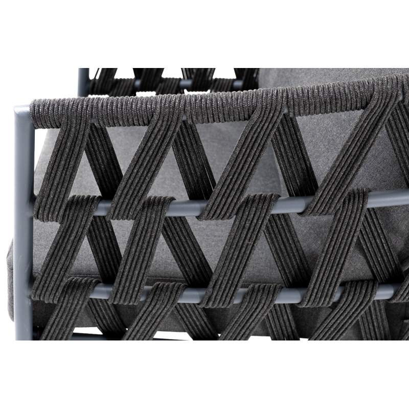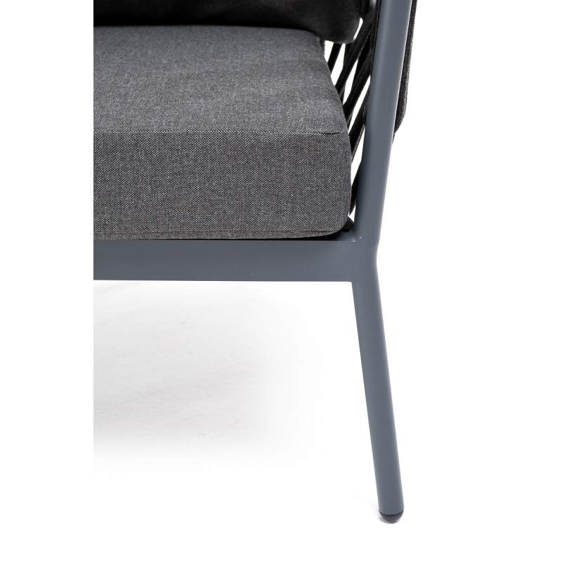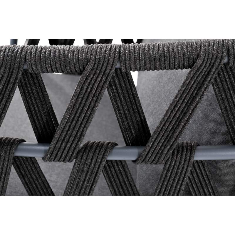Кресло имеет алюминиевый каркас, окрашенный порошковой краской в темно-серый (RAL7024) цвет. Боковины каркаса вручную оплетены роупом - эластичными синтетическими лентами, изготовленными из высокопрочных полиэфирных волокон. Цвет оплетки - темно-серый.