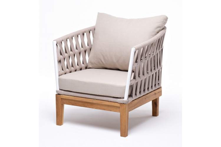 "Диего" кресло плетеное из роупа, основание дуб, каркас алюминий светло-серый (RAL7035) шагрень, роуп бежевый круглый, ткань бежевая 052
