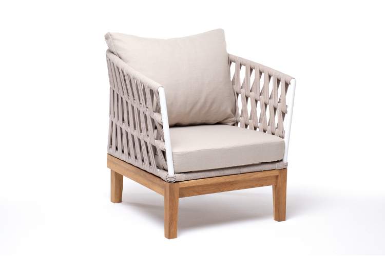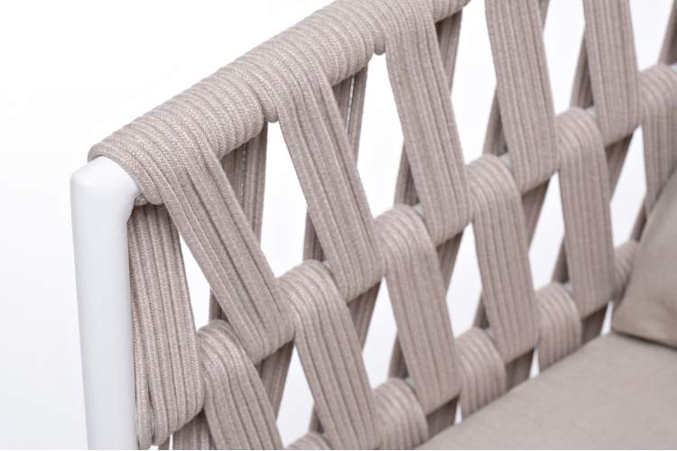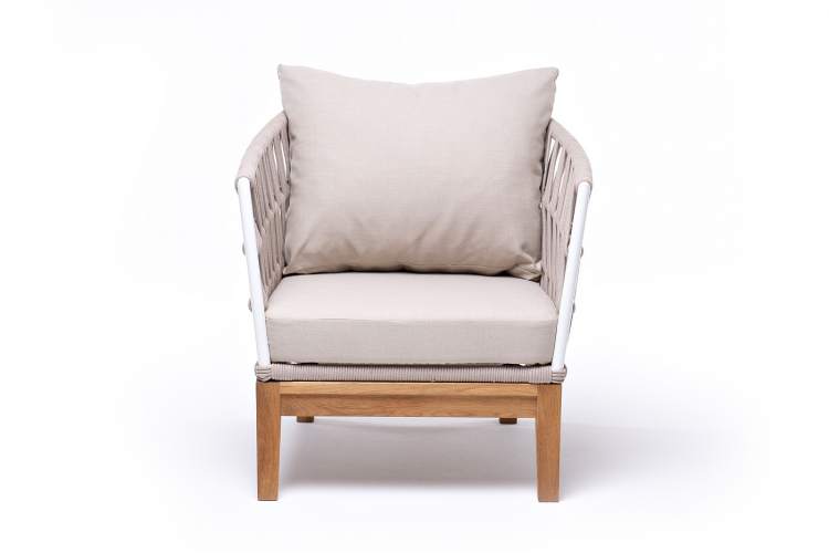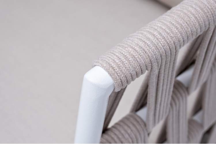 Плетеное кресло «Диего» с подушками в комплекте. Основание кресла - дуб, каркас из алюминия светло-серого (RAL7035) цвета. Боковины каркаса вручную оплетены роупом - эластичными синтетическими лентами, изготовленными из высокопрочных полиэфирных волокон. Цвет оплетки - бежевый. Подушки со съёмными чехлами, которые обработаны влагоотталкивающей пропиткой. Материал - 100% полиэстер, плотностью 300гр/м2. Размер кресла: 770×720×800 мм.