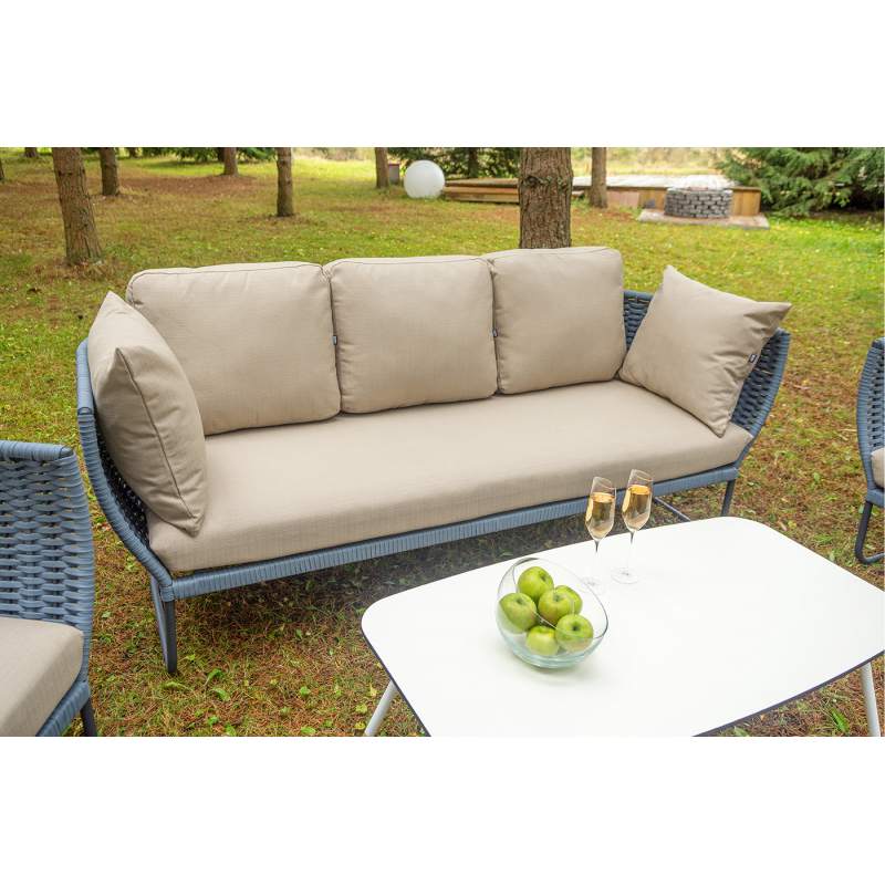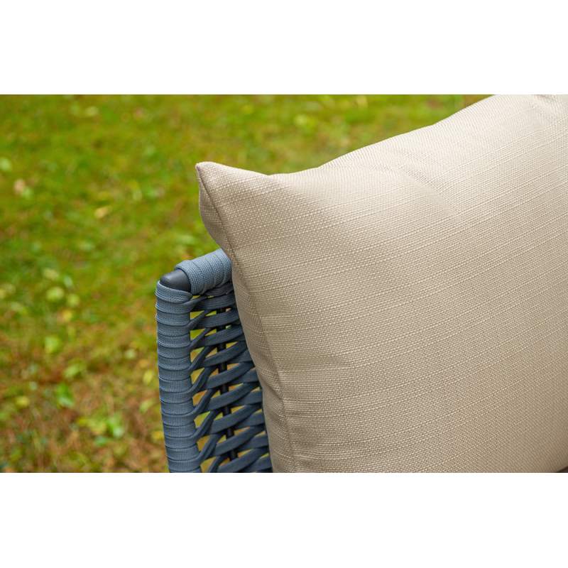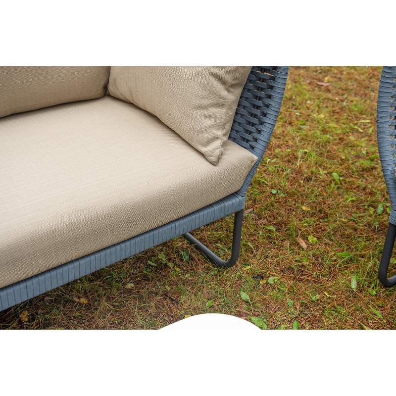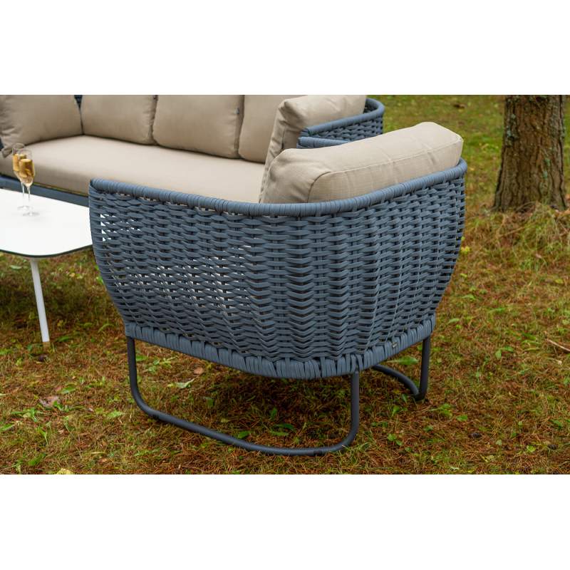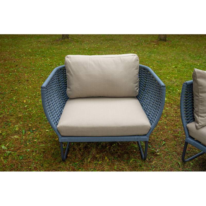 Боковины дивана и кресел вручную оплетены синими синтетическими лентами из высокопрочных полиэфирных волокон. Плетение придает мебели выразительный облик и удачно дополняет цвет каркаса.