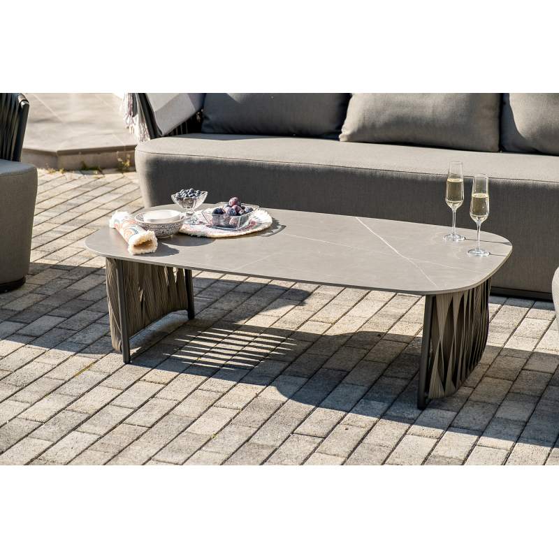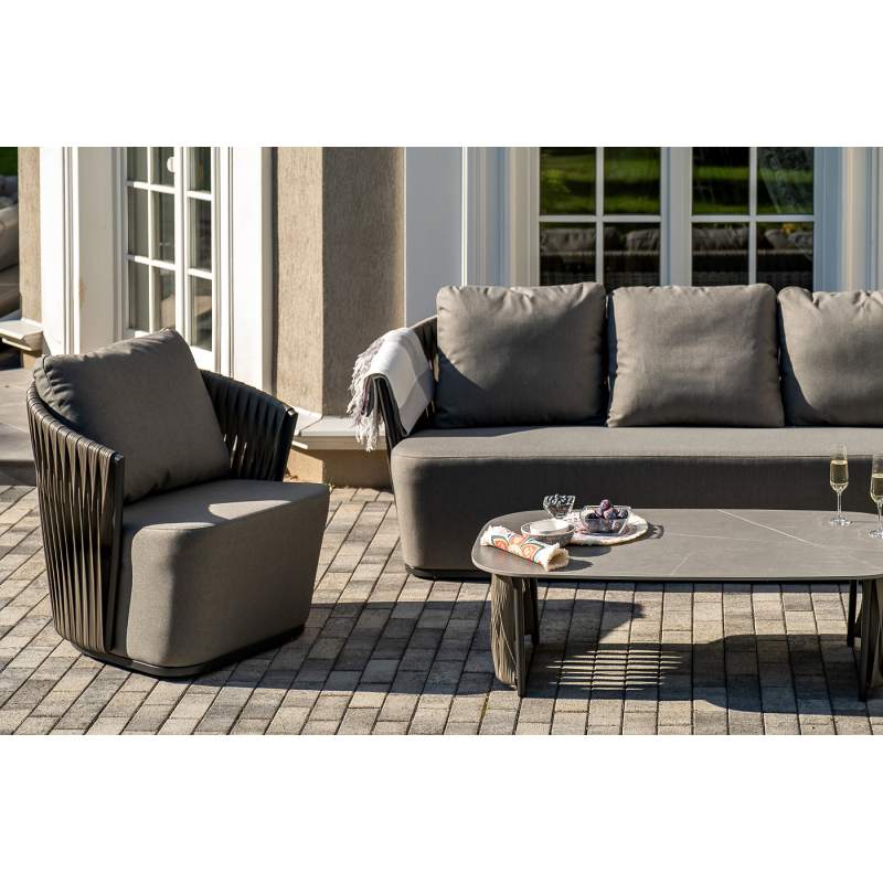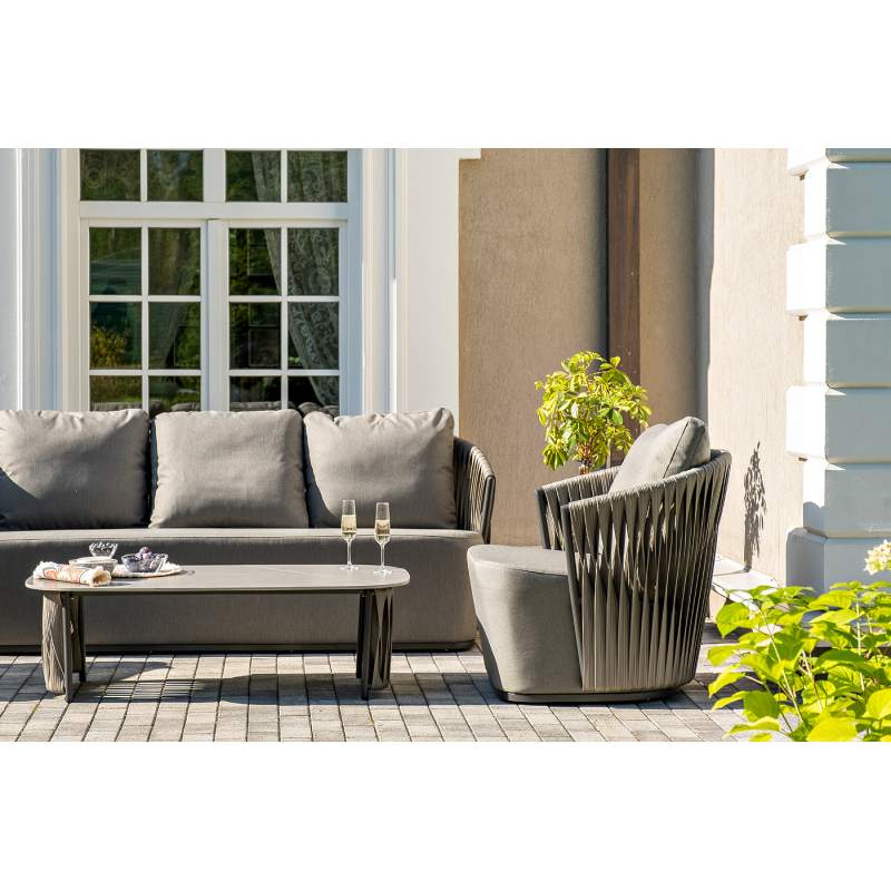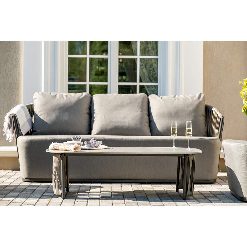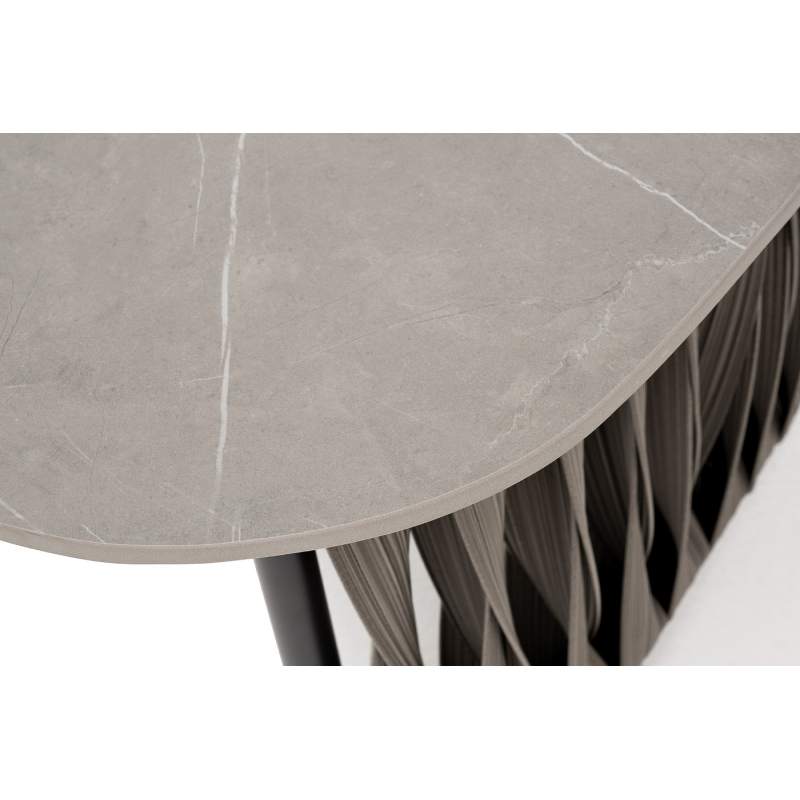 Журнальный столик выполнен из алюминия, окрашенного износостойкой краской графитового цвета. Столешница - овальная, выполнена из искусственного камня графитового цвета.