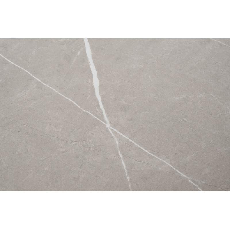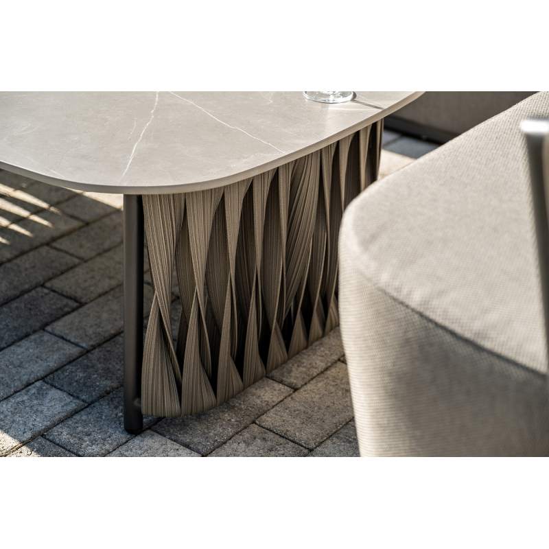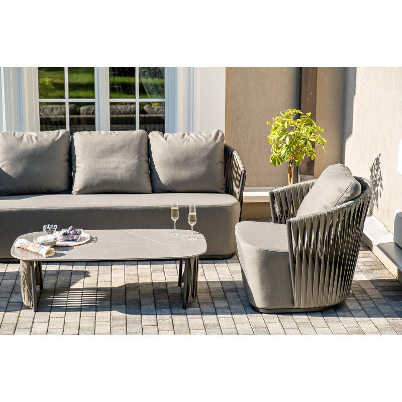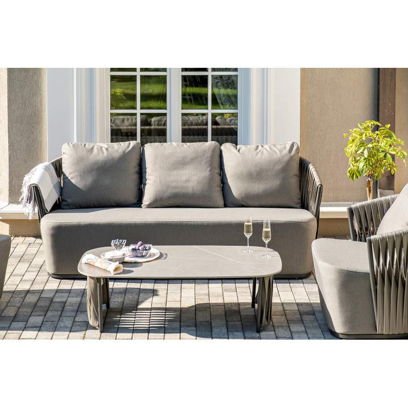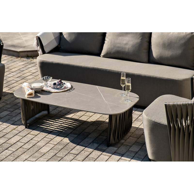 Журнальный столик выполнен из алюминия, окрашенного износостойкой краской графитового цвета. Столешница - овальная, выполнена из искусственного камня графитового цвета.