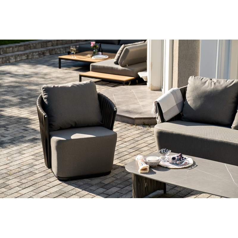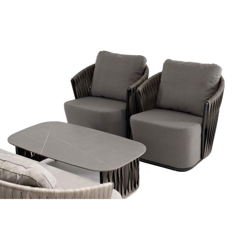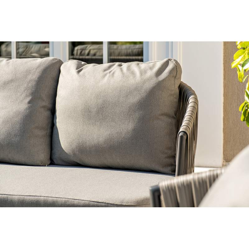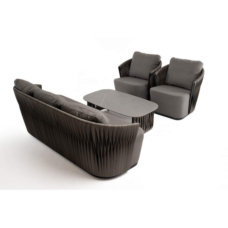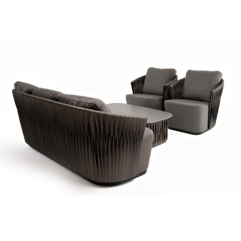 Из алюминия сделан устойчивый каркас мебели. Ее поверхность дополнена искусственным ротангом, из которого сделано ручное плетение - 50×3 мм, цвет графит.