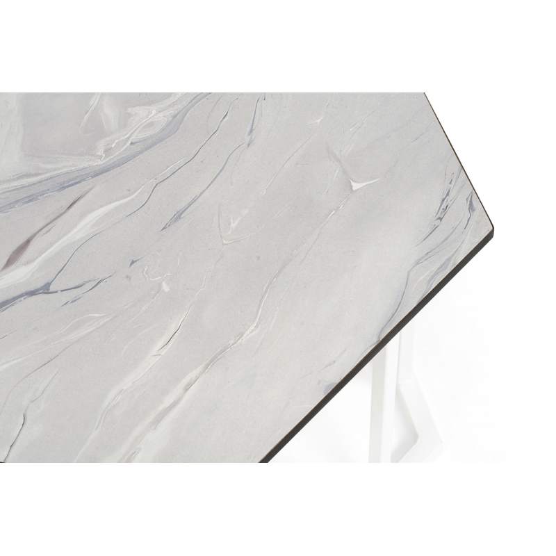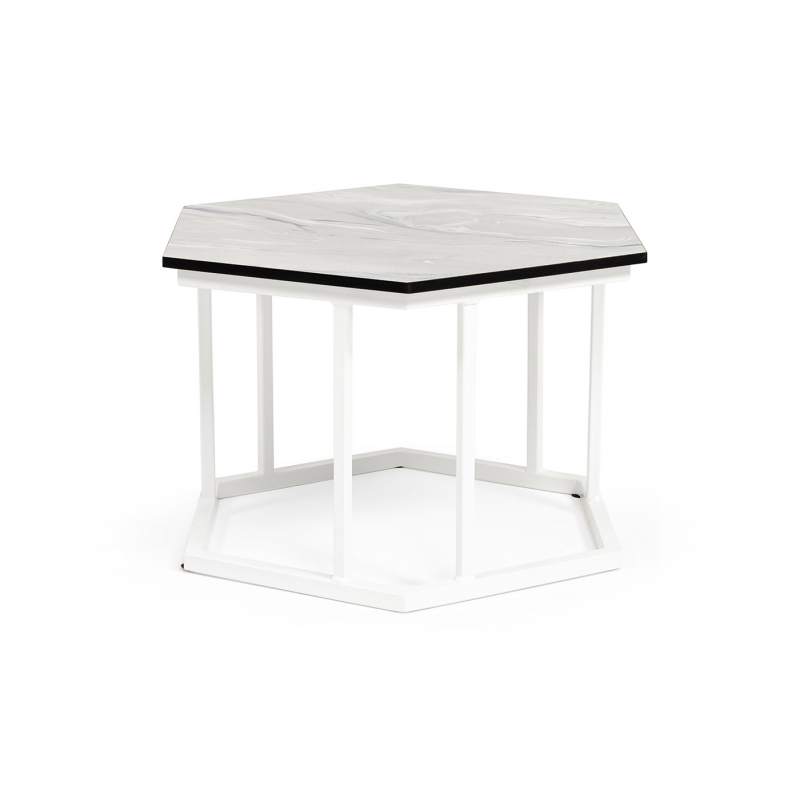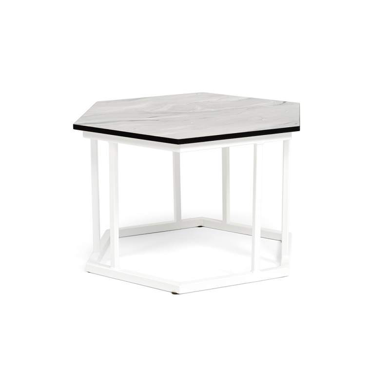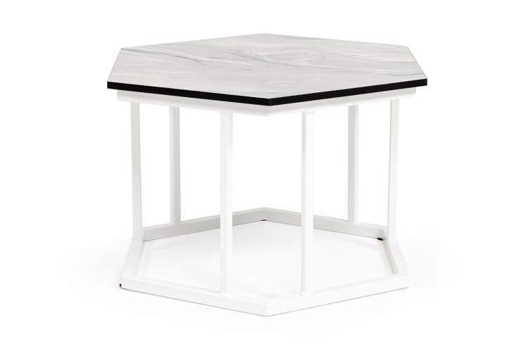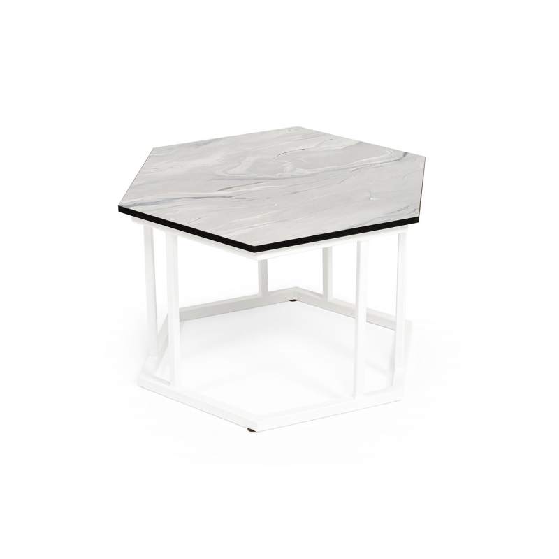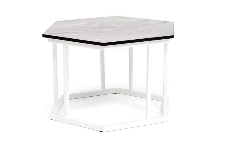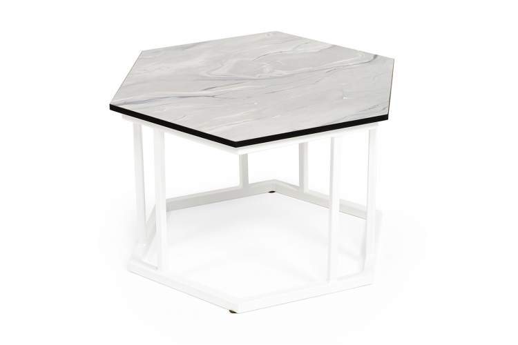 "Женева" интерьерный стол из HPL шестиугольный, D50, H35, цвет "мрамор пепел", каркас из стали белый муар