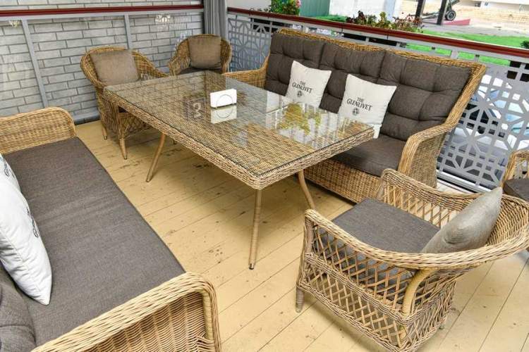 Диван «Гляссе» подходит для размещения сразу трех персон. Его основа из прочного алюминиевого каркаса. Размер модели – 1900×900×980мм. Ручное круглое плетение является основным декоративным элементом мебели. Оно выполнено из круглого искусственного ротанга соломенного цвета. В комплекте с трехместным диваном идут мягкие подушки для комфортного расположения. Чехлы съемные темно-серого цвета из высококлассного полиэстера с плотностью 230гр/м2. Защитные свойства ткани усиливаются при помощи влагоотталкивающей пропитки.