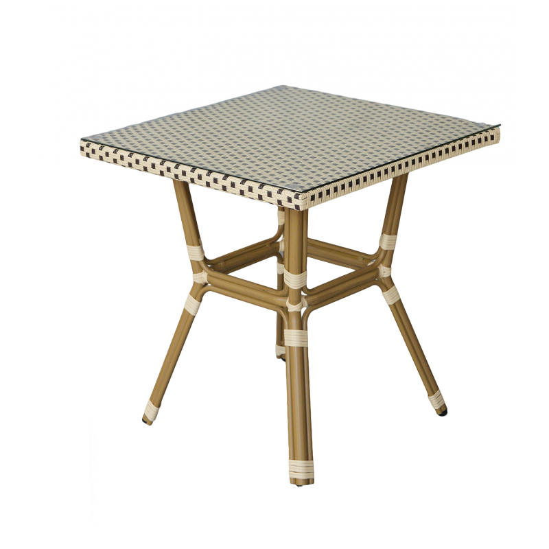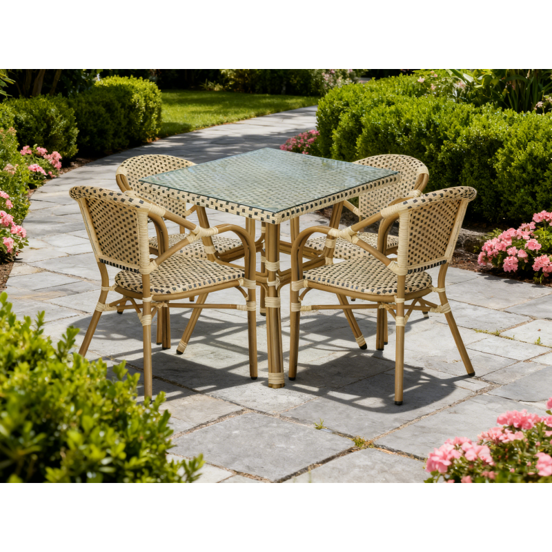 В набор входят квадратный стол и четыре стула, объединённые единым дизайнерским решением: изысканное ручное плетение из плоского искусственного ротанга в бежево‑коричневой гамме эффектно дополняет прочный алюминиевый каркас с износостойким покрытием.