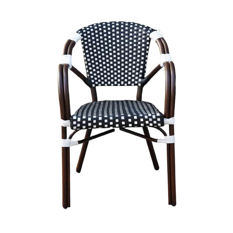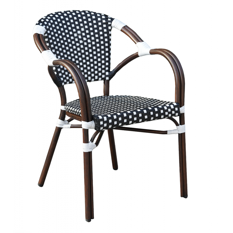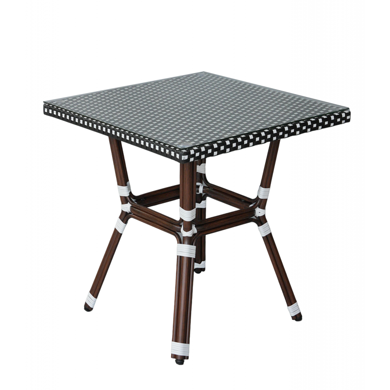 В набор входят квадратный стол и четыре стула, объединённые единым дизайнерским решением: изысканное ручное плетение из плоского искусственного ротанга в черно‑белой гамме эффектно дополняет прочный алюминиевый каркас с износостойким покрытием.