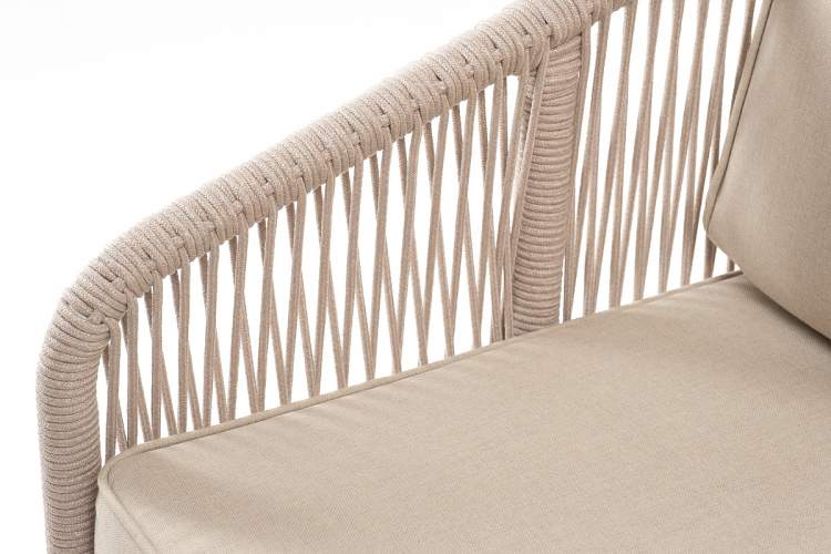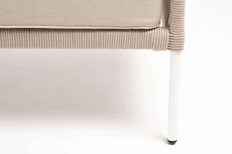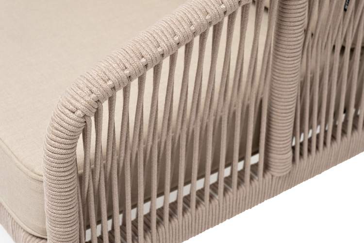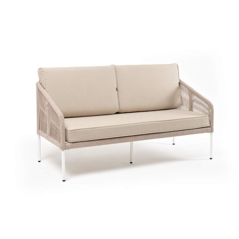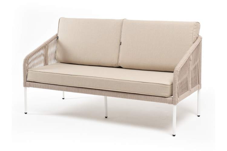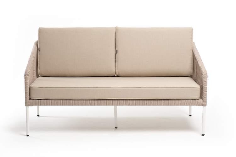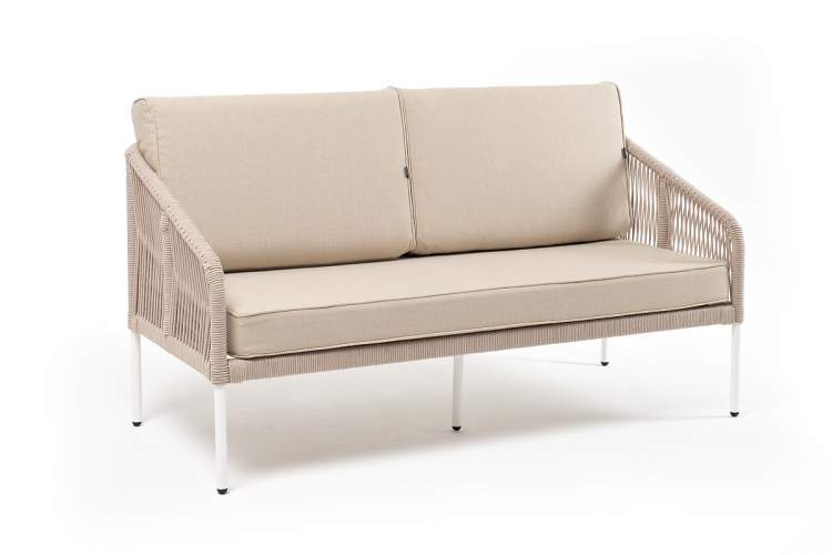 Двухместный диван «Канны» с подушками в комплекте. Диван имеет алюминиевый каркас, окрашенный порошковой краской в белый цвет. Боковины каркаса вручную оплетены роупом - эластичными синтетическими лентами, изготовленными из высокопрочных полиэфирных волокон бежевого цвета. Подушки состоят из наполнителя и съёмных чехлов. Материал - 100% полиэстер, плотностью 300гр/м2. Размер плетеного дивана: 1500×700×750 мм.
