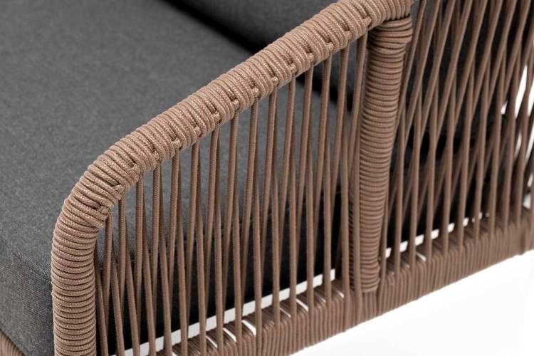 "Канны" диван 2-местный плетеный из роупа, каркас алюминий белый, роуп коричневый круглый, ткань серая