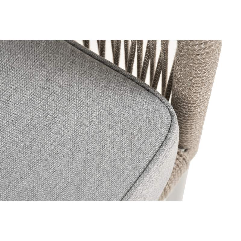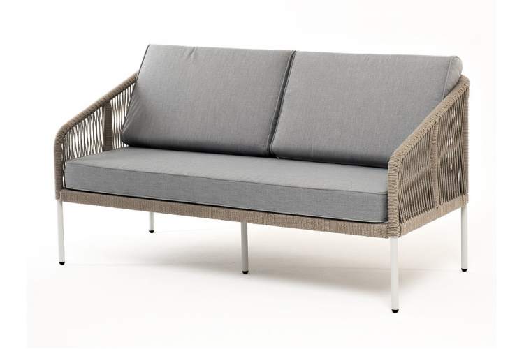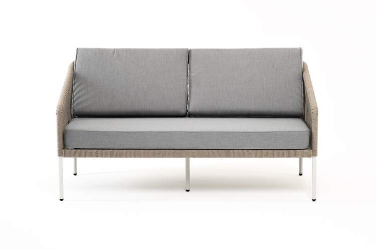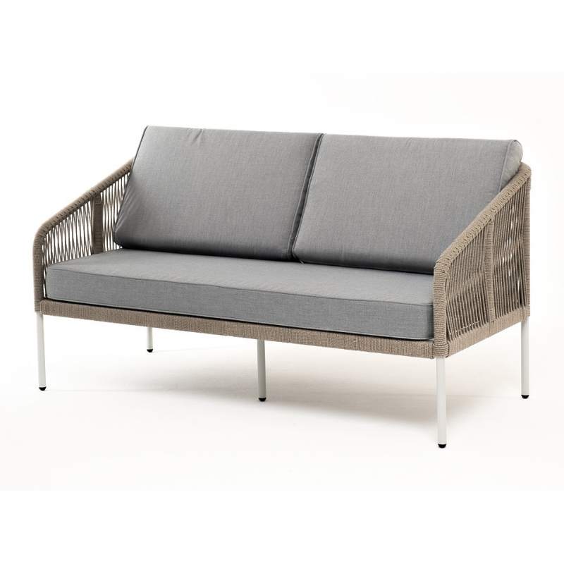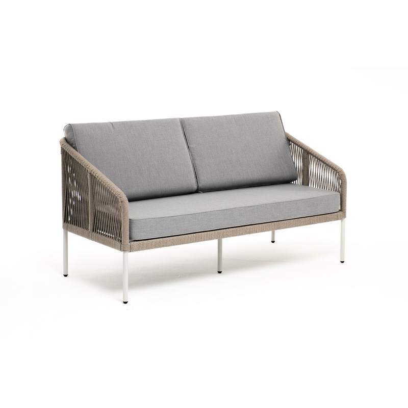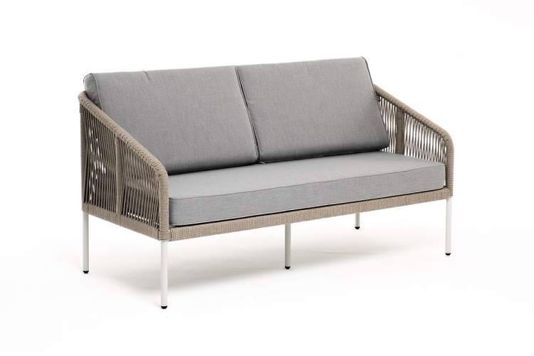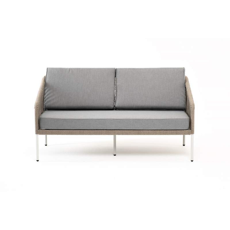 "Канны" диван 2-местный плетеный из роупа, каркас алюминий светло-серый (RAL7035) шагрень, роуп серый меланж круглый, ткань серая 017
