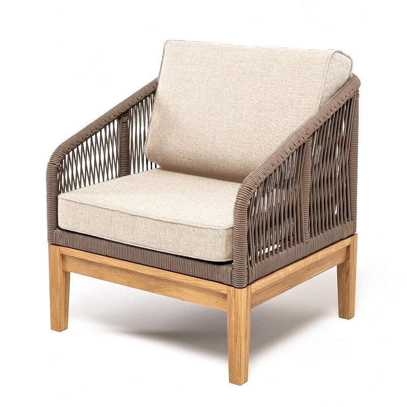 "Канны" кресло плетеное из роупа, основание дуб, роуп коричневый круглый, ткань бежевая 15052