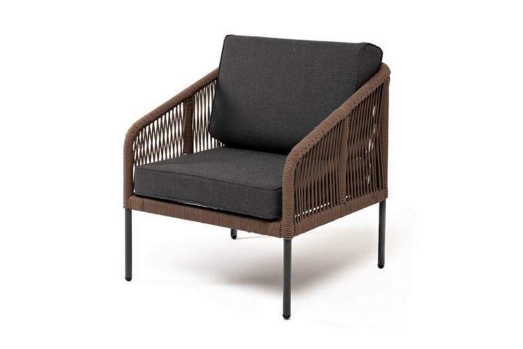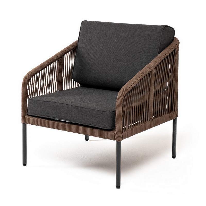 "Канны" кресло плетеное из роупа (узелки), каркас алюминий темно-серый (RAL7024) муар, роуп темно-серый круглый, ткань темно-серая 027