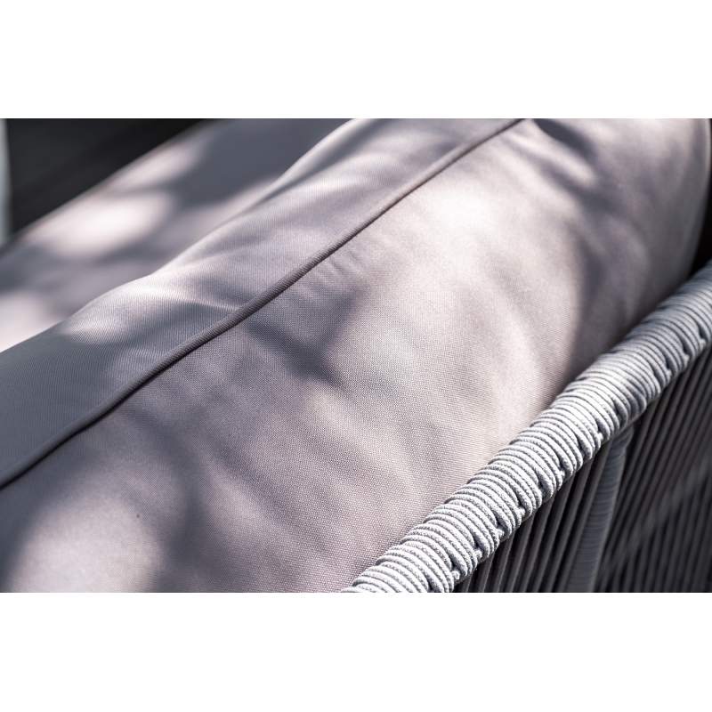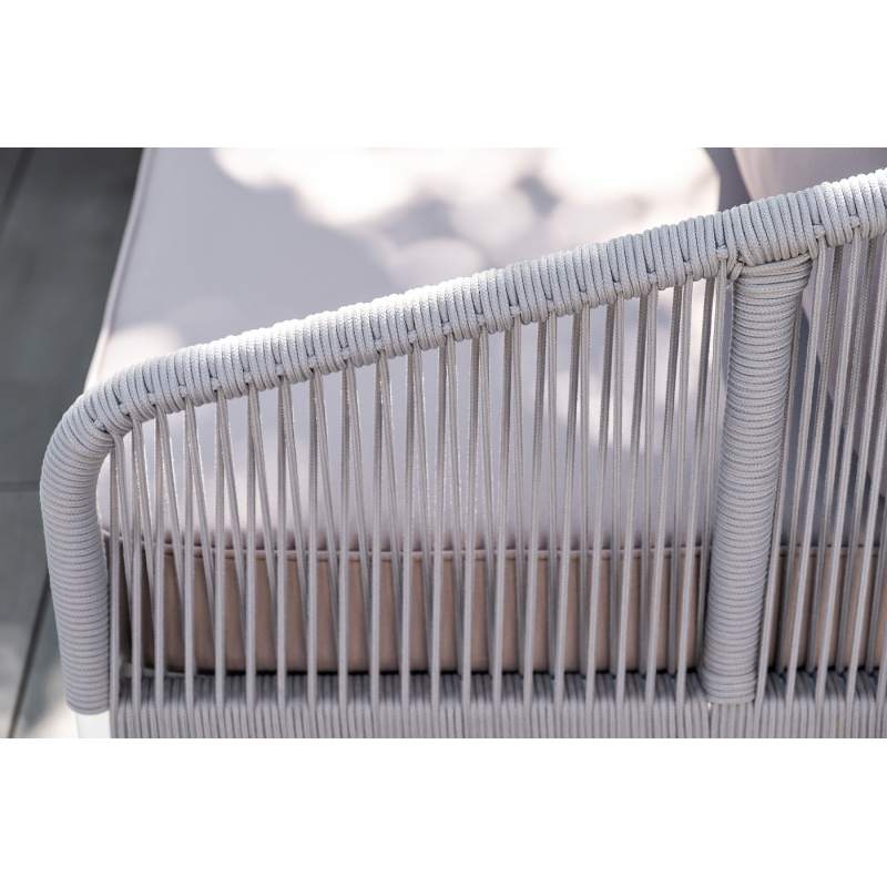 Каркас уличной мебели выполнен из износостойкого алюминия. Его дополняет светло-серая ручная оплетка, изготовленная на основе эластичных синтетических лент из полиэфирных волокон высокой прочности (роупа).