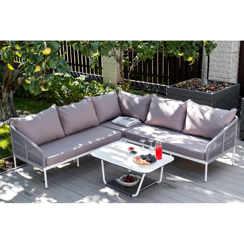 Диван идет в комплекте с мягкими подушками в чехлах светло-серого цвета. "Канны" правый модуль плетеный из роупа, каркас алюминий белый шагрень, роуп светло-серый круглый, т 1шт. 1 480Х850Х750, "Канны" левый модуль плетеный из роупа, каркас алюминий белый шагрень, роуп светло-серый круглый, тк 1шт. 1 480Х850Х750, "Канны" угловой модуль плетеный из роупа, каркас алюминий белый шагрень, роуп светло-серый круглый, 1шт. 850Х850Х750, "Гранада" журнальный стол 90х60см из HPL, цвет "молочный", каркас белый муар, роуп темно-серый кругл 1шт. 900Х600Х420,