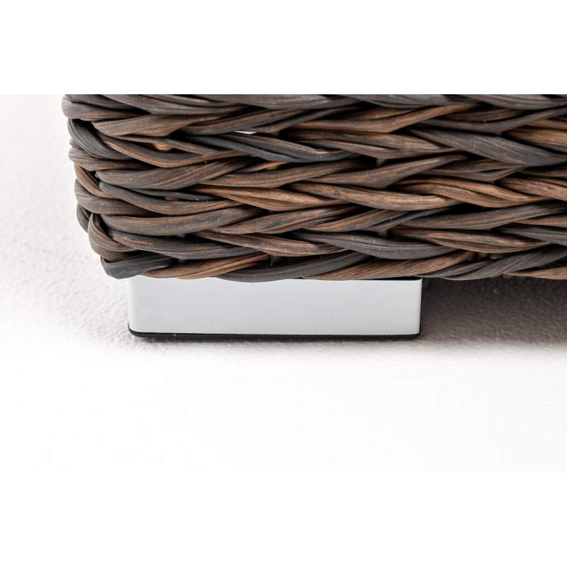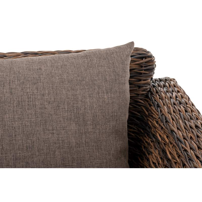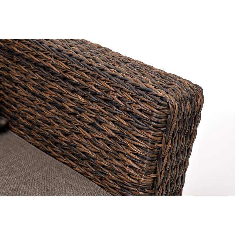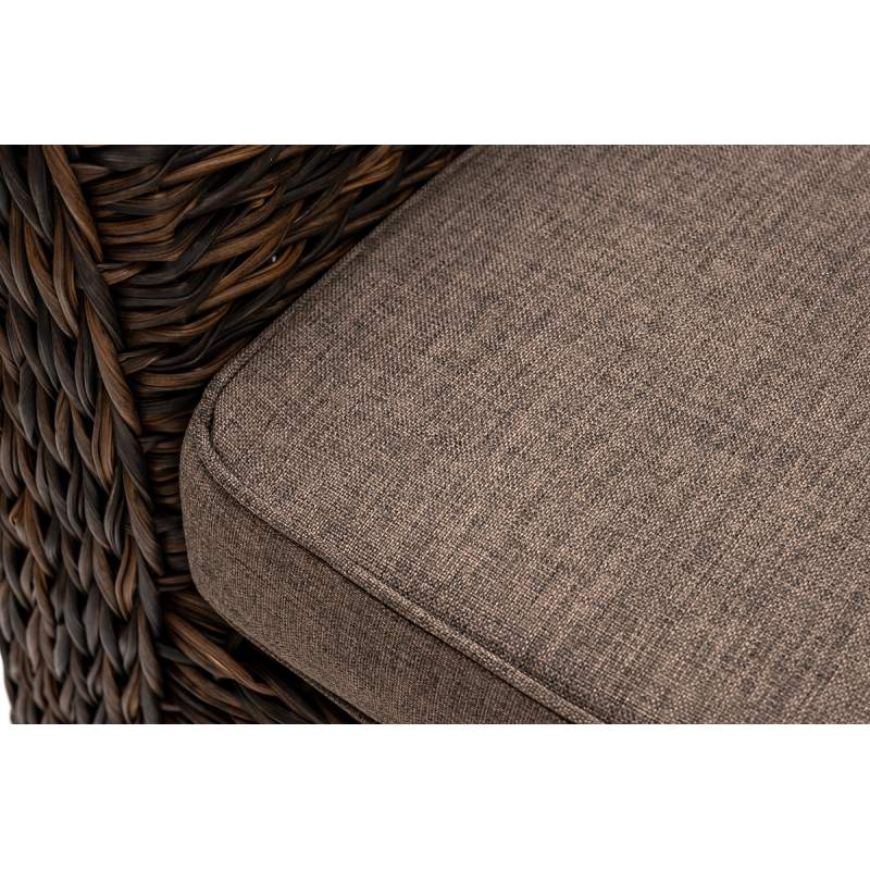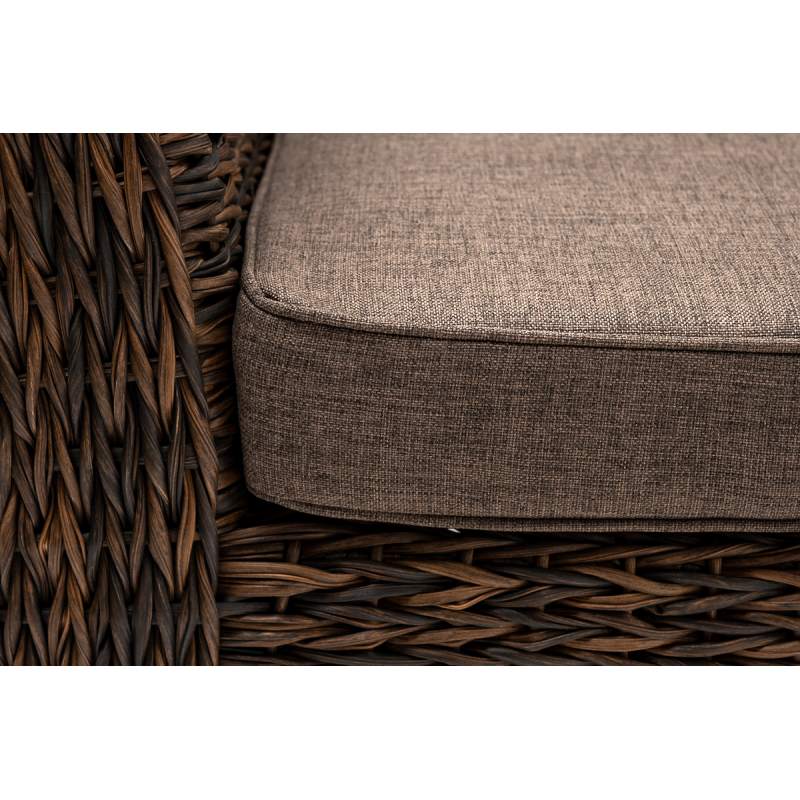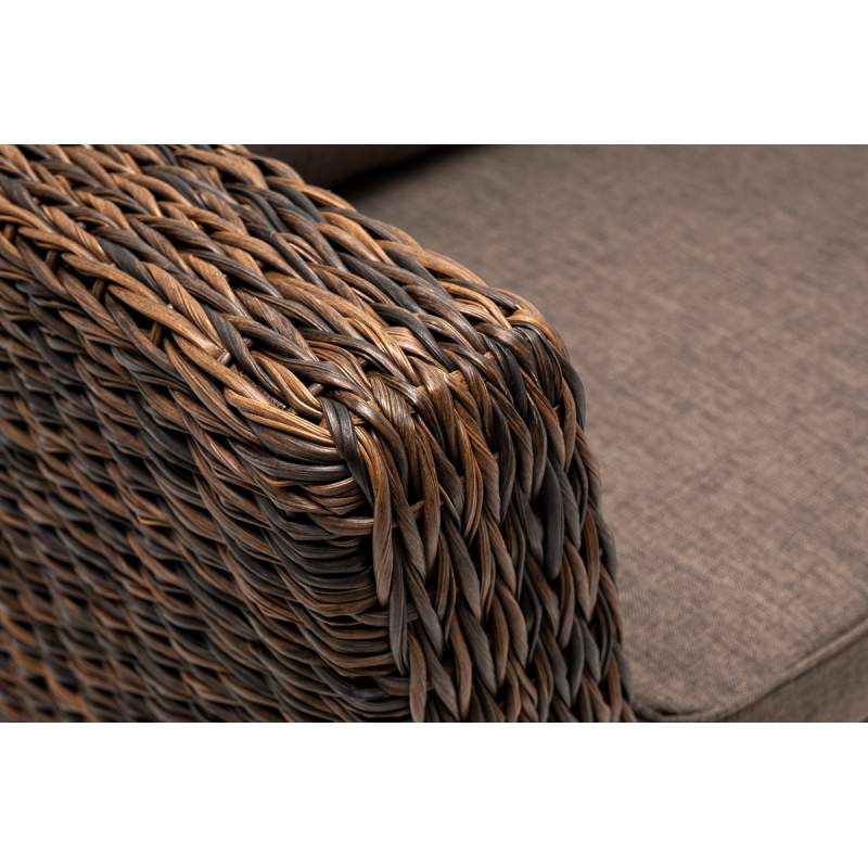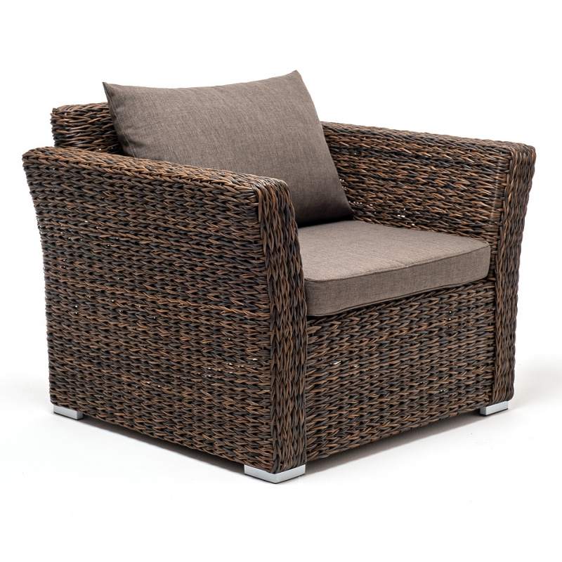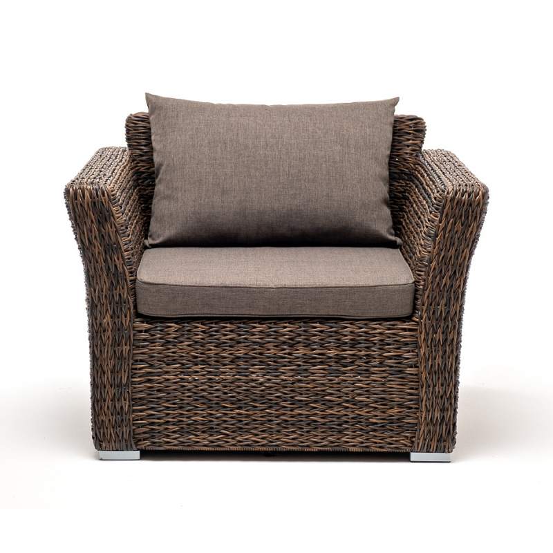 Кресло из искусственного ротанга «Капучино» коричневого цвета, прекрасно подходит для обустройства веранды, а относительно небольшой вес, который составляет 21,5 кг, увеличивает мобильность данной модели. Плетение используется вида «гиацинт».