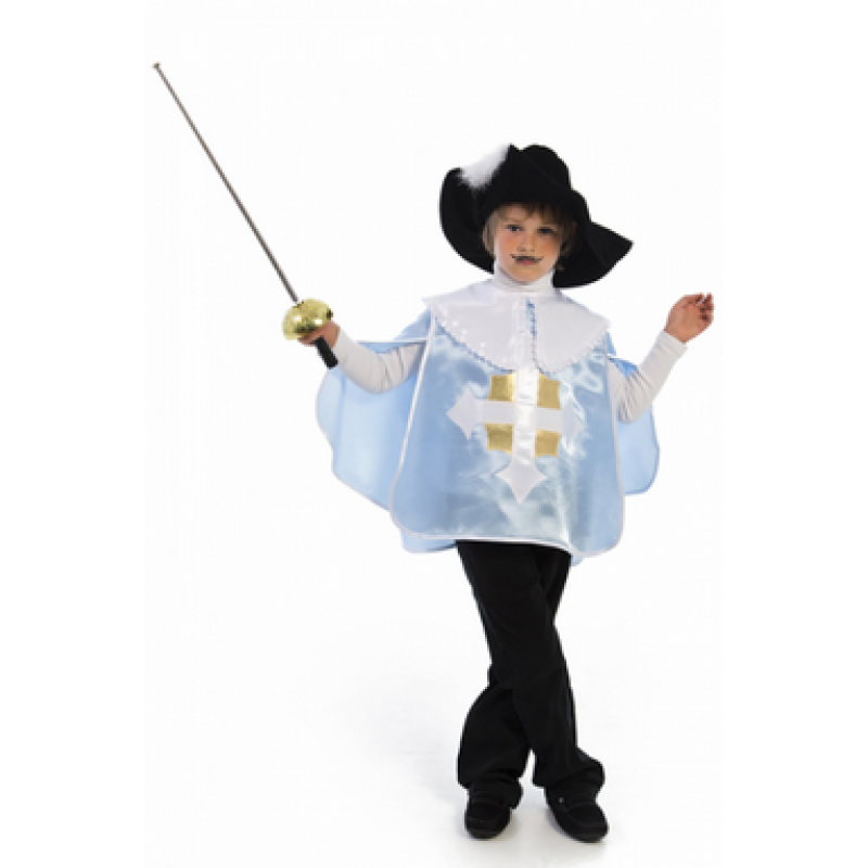 Легендарный роман Александра Дюма вдохновил наших художников на создание карнавального костюма "Мушкетер". Костюм состоит из широкого голубого плаща с аппликацией. Плащ украшен воротником, отороченным кружевом. В комплект входит также широкополая шляпа из велюра. Рекомендуем дополнить костюм белой рубашкой, темными брюками, ботинками в цвет брюк. Комплектация: Плащ из крепсатина с воротником Шляпа Ткани: Крепсатин (100% полиэстер) Велюр (80% хлопок, 20% полиэстер) Текст на этикетке: Рекомендуется для детей старше 3-х лет для кратковременного ношения. Срок службы 5 лет при аккуратном ношении. Способ ухода за изделием: ручная стирка при температуре 30 С° с применением нейтральных моющих средств. Не отжимать. Не сушить в машине. Гладить при низкой температуре. р.128-134