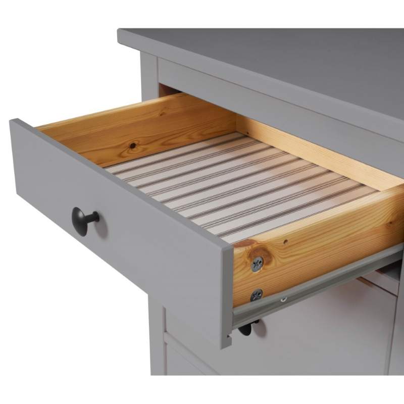 В комоде предусмотрено пять ящиков на роликовых направляющих, которые изнутри не покрашены, как основная часть, что придает им естественный вид.