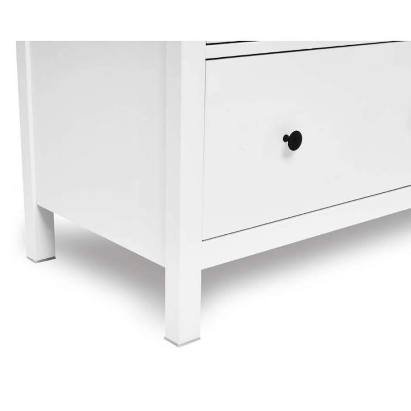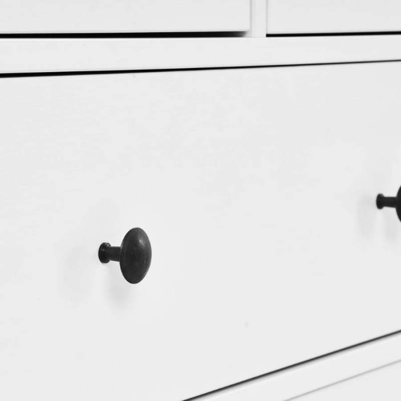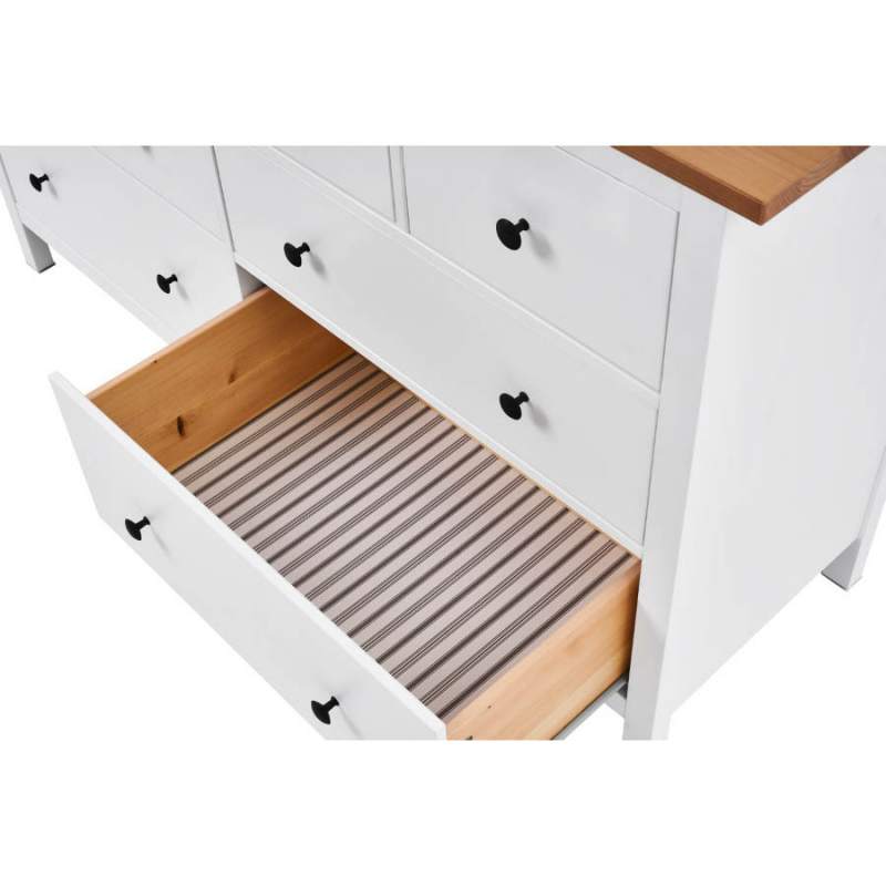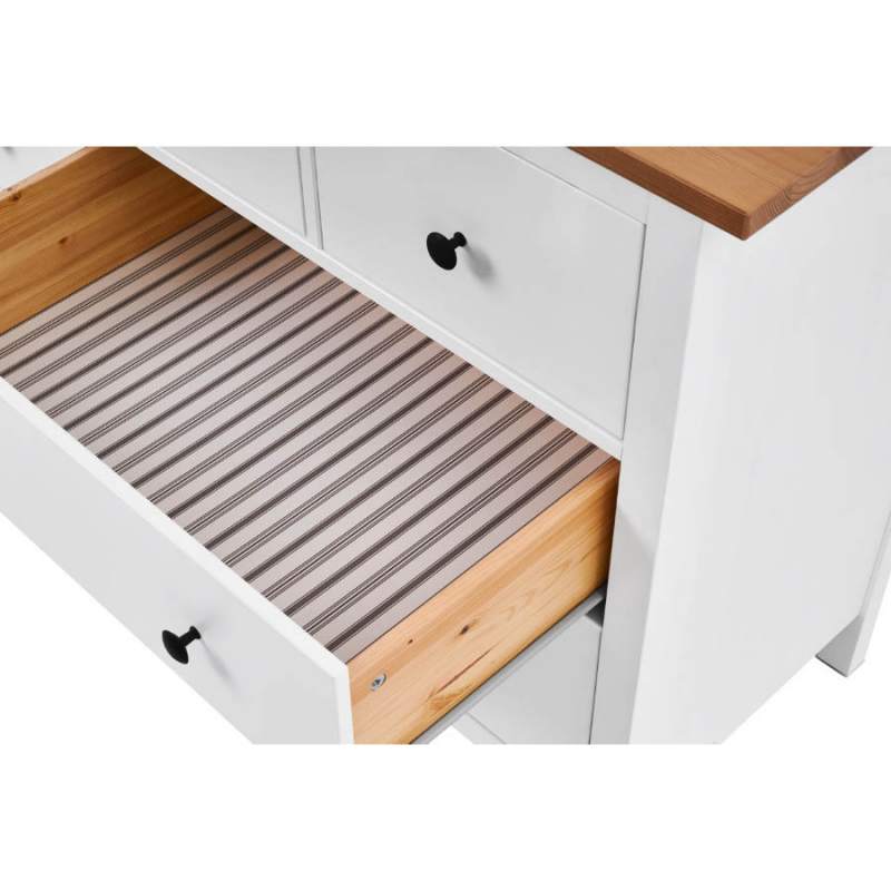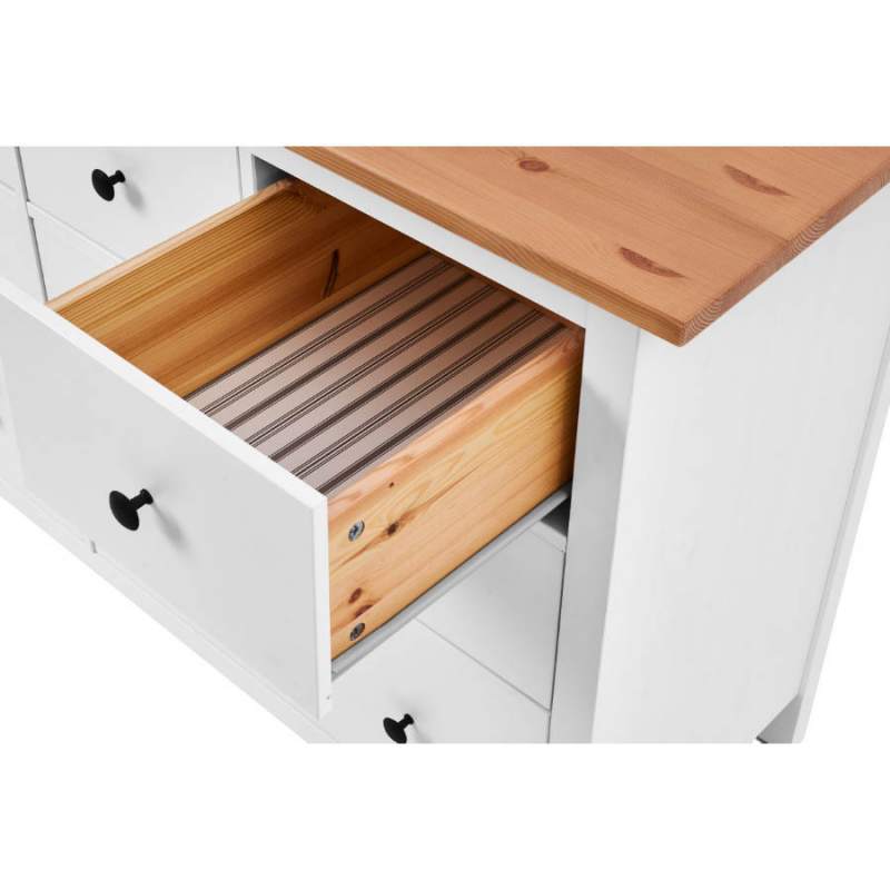 В комоде предусмотрено восемь ящиков на роликовых направляющих, которые изнутри не покрашены, как основная часть, что придает им естественный вид.