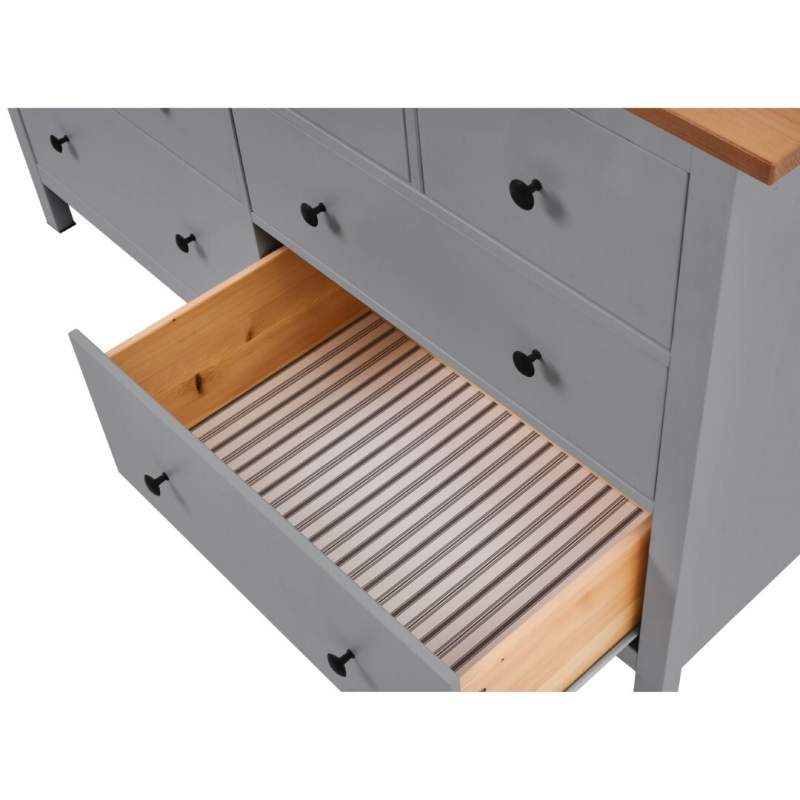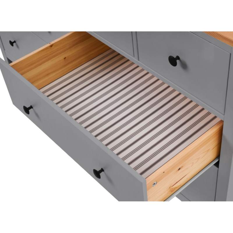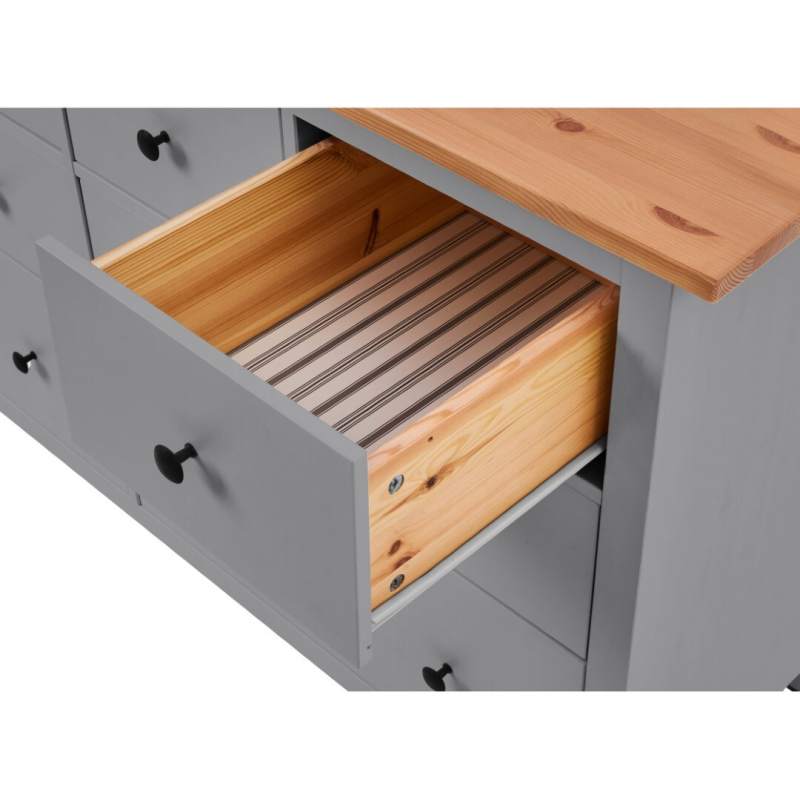 В комоде предусмотрено восемь ящиков на роликовых направляющих, которые изнутри не покрашены, как основная часть, что придает им естественный вид.