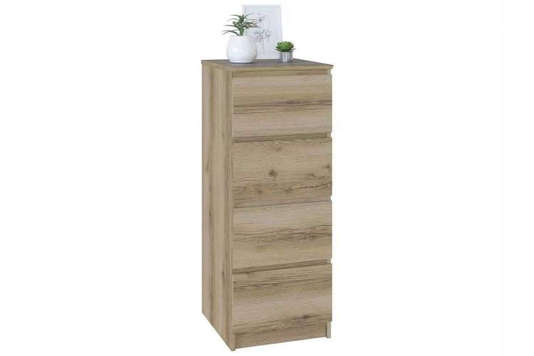 Узкий и высокий комод легко разместится в любой даже небольшой комнате и прихожей. Комод выполнен из высококачественных материалов. Ручки на ящиках комода не предусмотрены. Сверху ящиков идет спил под углом 45 градусов, что позволяет выдвигать ящики взявшись сверху. Модель выполнена из ЛДСП толщиной 16 мм.