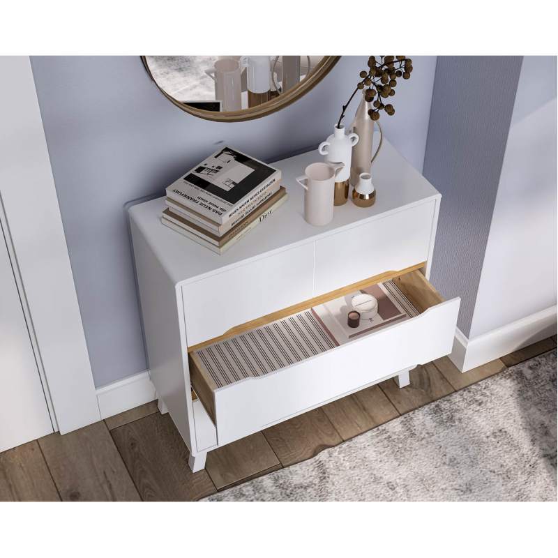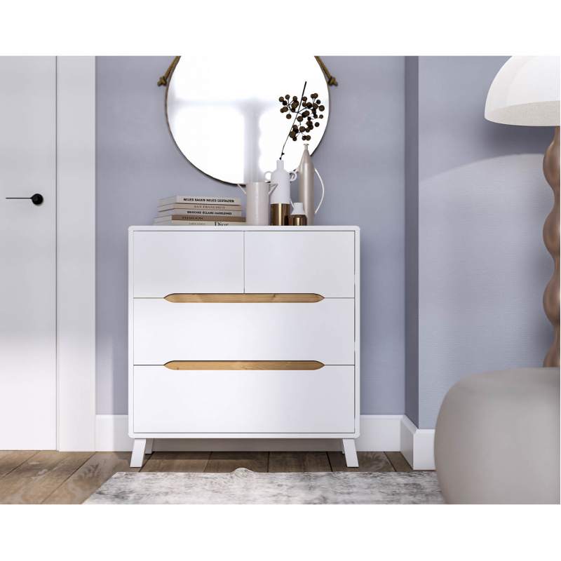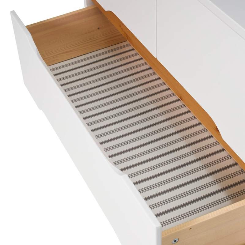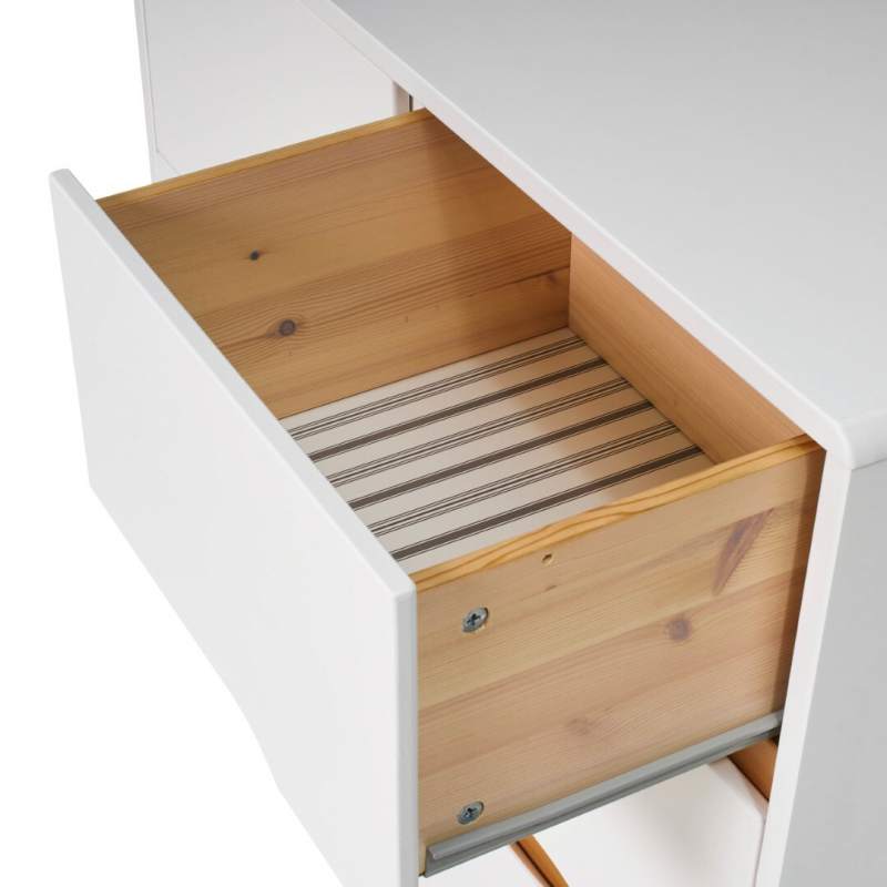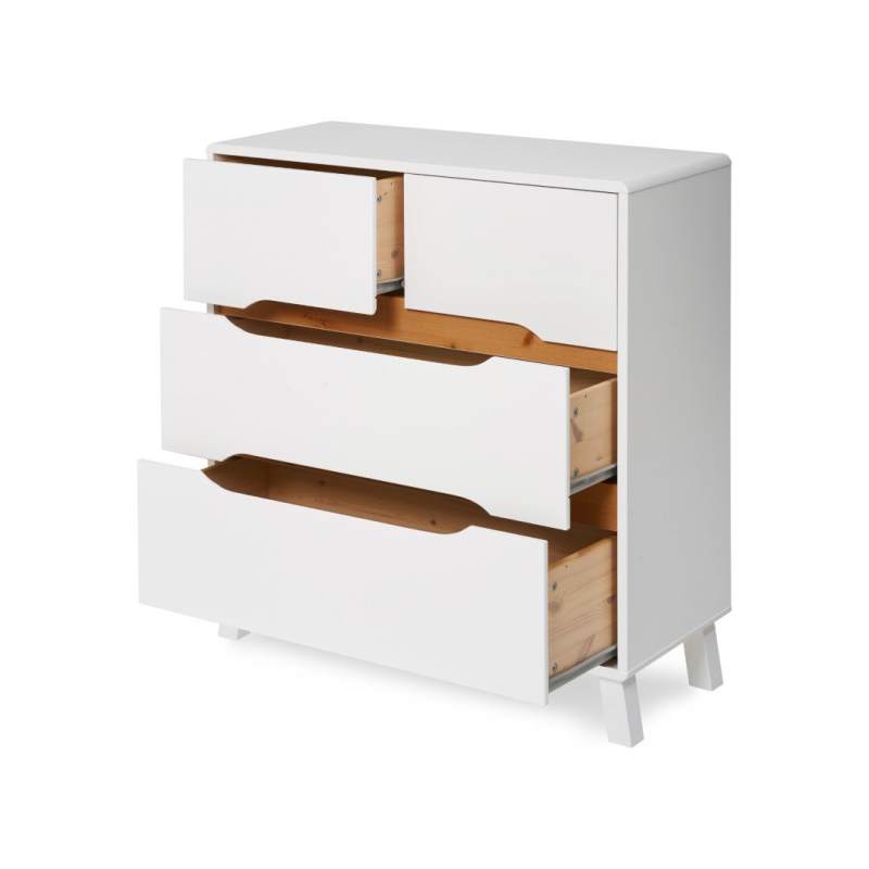 В комоде предусмотрено четыре ящика на роликовых направляющих, которые изнутри не покрашены, как основная часть, что придает им естественный вид.