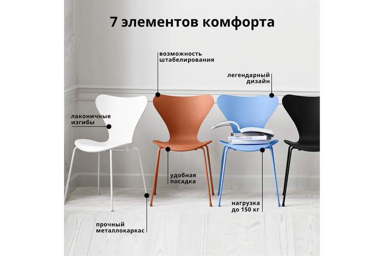 В элегантных и плавных очертаниях стула из серии SEVEN внимательный ценитель сразу узнает одну из самых популярных современных моделей, являющихся истинным эталоном скандинавской простоты и функциональности. Лаконичные изгибы, эргономичность, легкость и компактность – вот, пожалуй, главные отличительные особенности стульев SEVEN. Идеально подходящие для дома, офиса, а также для общественных пространств, стулья SEVEN в мгновение ока штабелируются в одну компактную конструкцию, предоставляя Вам и Вашим гостям простор для истинного полёта фантазии.
