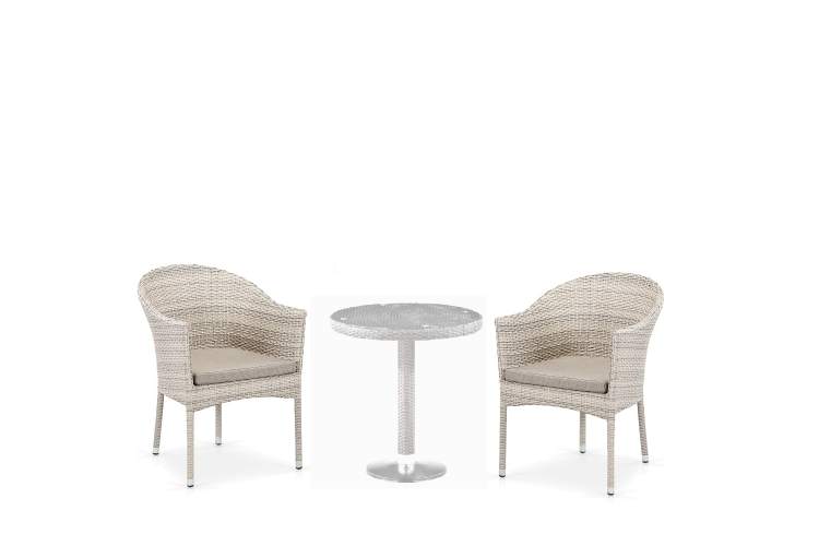 Комплект мебели для кафе T601/Y350C-W85 Latte (2+1) состояит из круглого стола на центральной опоре и двух кресел с подушками. Цвет ротанга Латте, при разном освещении он смотрится по разному.
