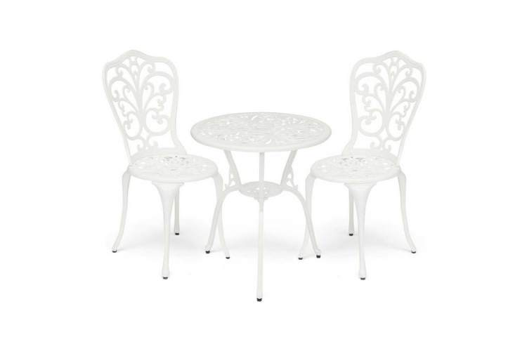 Изысканный комплект кованой мебели Secret De Maison Romance из коллекции JARDIN, состоящий из стола и двух стульев, будет прекрасно смотреться в загородном доме, на дачной веранде, отлично подойдёт для отдыха на приусадебной лужайке. Высокое качество и красота неповторимых ажурных узоров столешницы и спинок стульев добавит благородства в ваш ландшафтный дизайн, подчеркнет вкус и статус своего владельца. Устойчивый стол на трех ножках, дополненный миниатюрной нижней полочкой, и два удобных стула выполнены из литого алюминия и покрашены в белый цвет. Эта функциональная, прочная и красивая мебель займет важное место в оформлении вашего сада. Комплект устойчив к любым погодным условиям и будет радовать вас долгие годы своим первоначальным видом. Изделия прекрасно сочетаются с мебелью из коллекции JARDIN, поставляются в разобранном виде. Для вашего удобства на стулья можно дополнительно приобрести декоративные подушки из нашей коллекции текстиля.