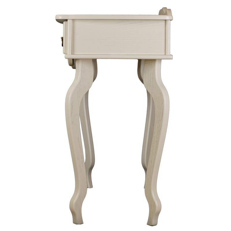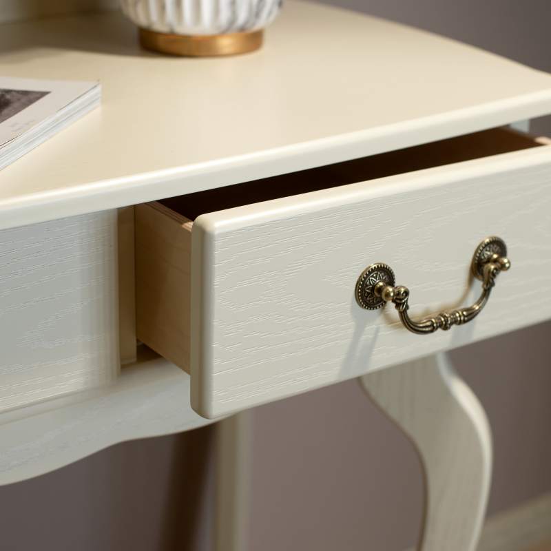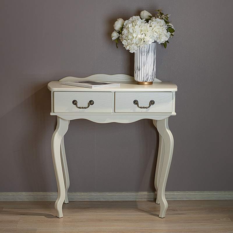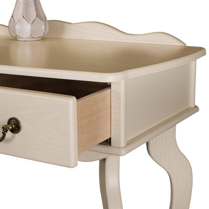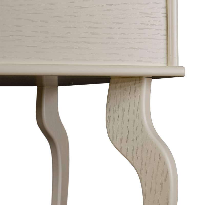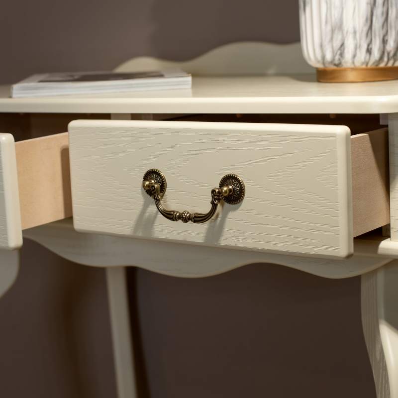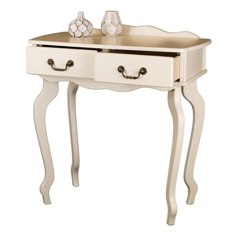 Изящная консоль Берже 21 отлично дополнит классический интерьер квартиры или дома. Модель на ножках удобно перемещать между комнатами. Деревянная модель выполнена из МДФ, что обеспечивает прочность и долгий срок службы. Все детали покрыты защитной эмалью с теснением, передающим текстуру дерева. Консоль обладает двумя вместительными ящиками, в которых легко поместится аксессуары и другие мелочи.