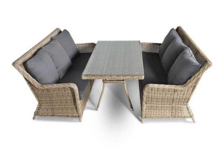 Обеденная группа «Кортадо» рассчитана на 6 персон. Если нужно увеличить число посадочных мест, то дополнительно можно приставить кресла. Для данного комплекта подойдут любые кресла соломенного оттенка. Комплект состоит из: - стола «Латте», размером – 1600×900×750 мм - двух трехместных диванов «Гляссе», размер каждого – 1900×900×980 мм Для создания каркаса мебели используется алюминий. Каркас плотно оплетается вручную круглым искусственным ротангом. Цвет набора – натуральный соломенный. Серо-коричневые чехлы защищают мягкие подушки, которые идут в комплекте с диванами. Они пошиты из полиэстера, плотность ткани - 230гр/м2. Материал имеет пропитку с влагоотталкивающими свойствами. Обеденный стол дополнен стеклянной столешницей. Она обладает ударопрочными свойствами, изготовлена из закаленного стекла толщиной 5 мм. "Латте" плетеный стол из искусственного ротанга 160х90см, цвет соломенный 1шт. 1 600Х900Х750, "Гляссе" диван трехместный из искусственного ротанга, цвет соломенный 2шт. 1 900Х880Х990,